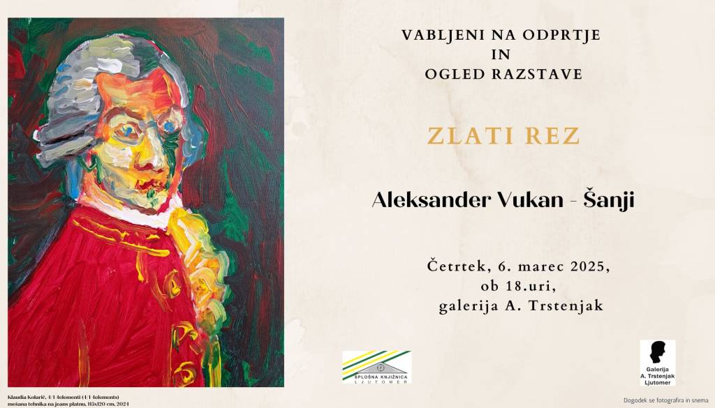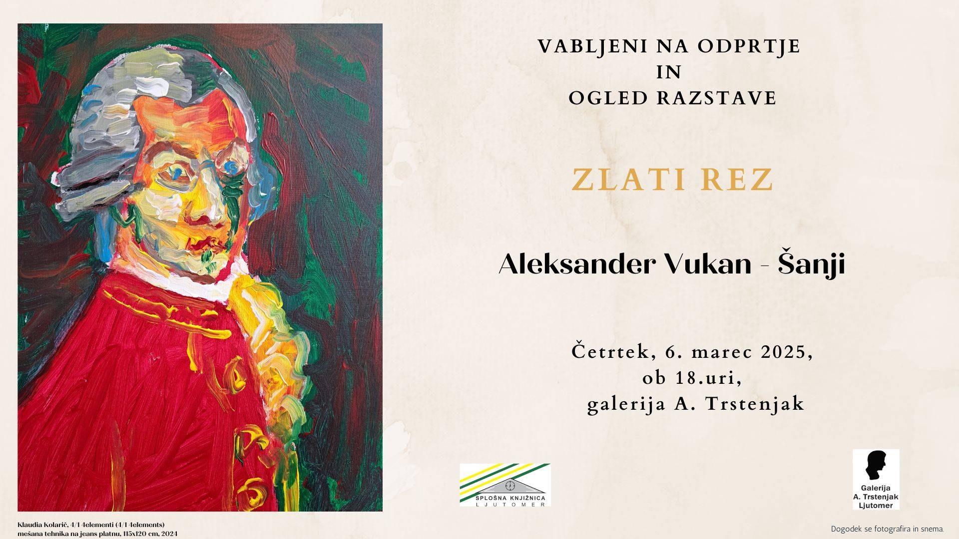 Muzej in Galerija Ante Trstenjak LjutomerVabimo vas na ogled razstave "ZLATI REZ" akademskega slikarja Aleksandra Vukan - Šanji, kjer se skozi portrete, tihožitja in akte razkriva globoka povezanost med obliko, harmonijo in kompozicijo. Osrednji motiv razstave je portret Mozarta, ki služi kot izhodiščna točka celotne postavitve. Dodatni portreti nadgrajujejo osnovno vizijo, medtem ko tihožitja ob aktih potrjujejo celovito umetniško pripoved.