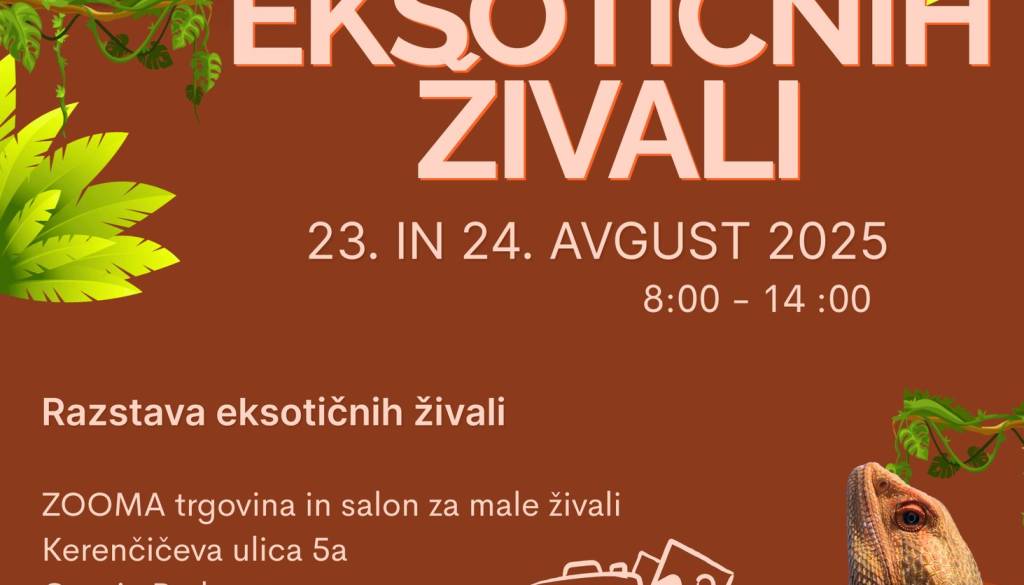 ZOOMA trgovina in salon za male živaliZOOMA vabi, da se jim v soboto in nedeljo, 23. in 24. avgusta 2025, vsak dan med 8. in 14. uro pridružite na nepozabnem dogodku z eksotičnimi živalmi, vključno z veliko kačo!