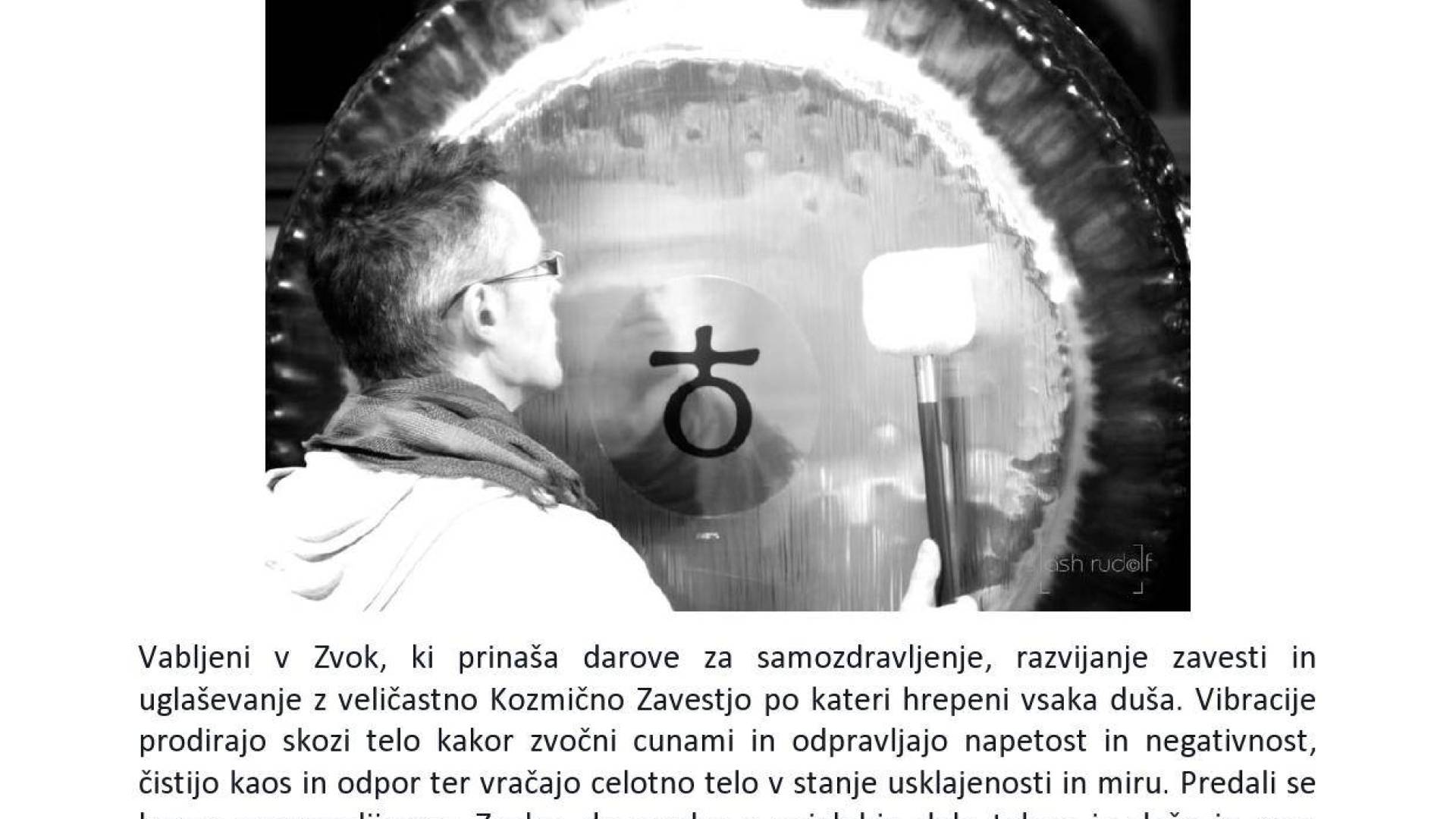 Sofija medgeneracijska hiša Lendava Glavna ulica 48 9220 LendavaVabljeni v Zvok, ki prinaša darove za samozdravljenje, razvijanje zavesti in uglaševanje z veličastno Kozmično Zavestjo po kateri hrepeni vsaka duša. Vibracije prodirajo skozi telo kakor zvočni cunami in odpravljajo napetost in negativnost, čistijo kaos in odpor ter vračajo celotno telo v stanje usklajenosti in miru. Predali se bomo neponovljivemu Zvoku, da prodre v najglobje dele telesa in duše in nam pomaga do enovitosti naše biti. Skozi Zvok planetarnega Gonga in ostalih holističnih instrumentov vas bo vodil Aleš Ifko. Da boste v polnosti doživeli Zvočno Gong kopel, si prinesite mehko podlogo za udobje na tleh, odejo da vam bo toplo, manjši vzglavnik in steklenico vode, v kateri odnesemo informacijo doživetega s seboj.