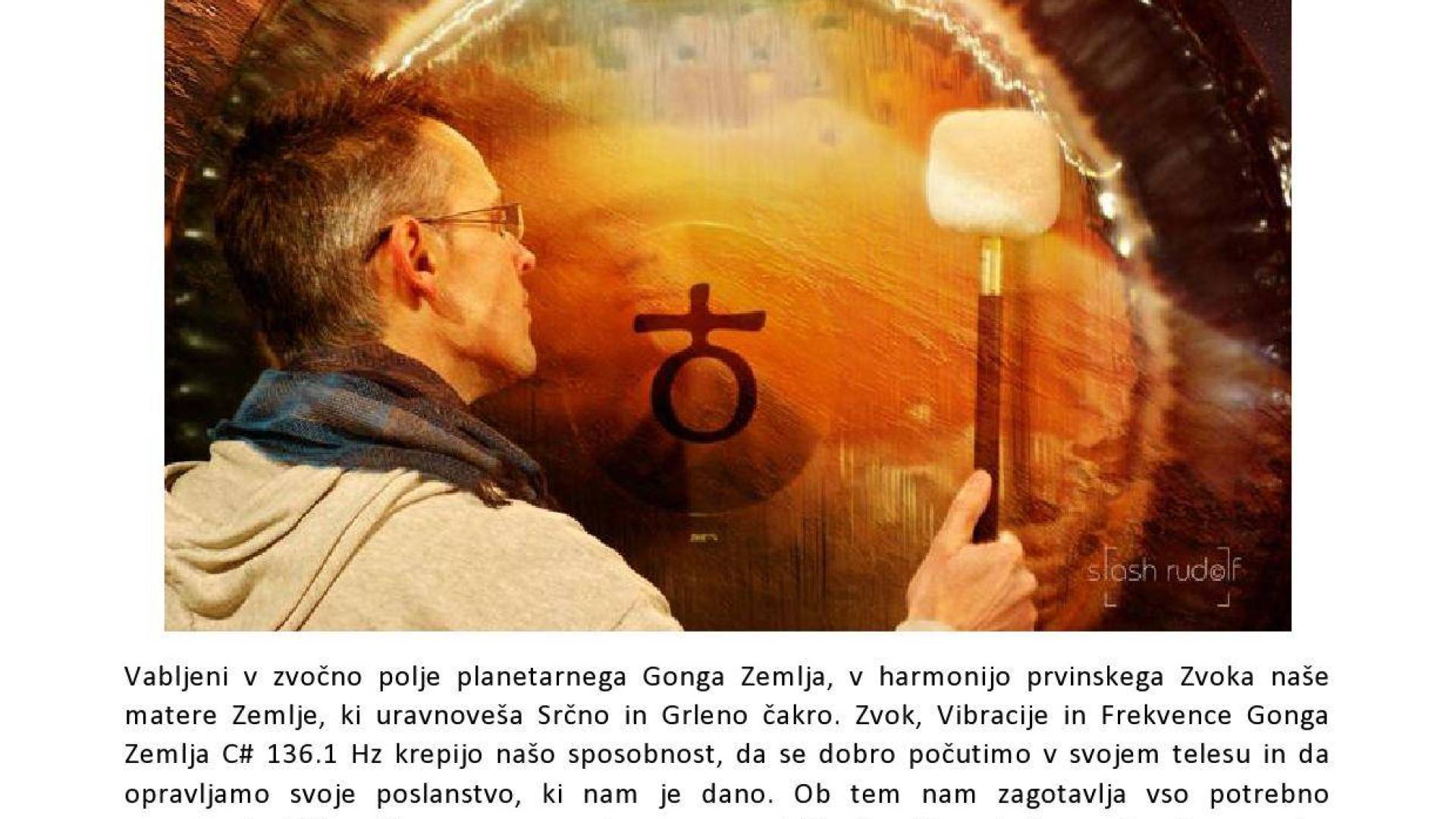 Vabljeni v zvočno polje planetarnega Gonga Zemlja, v harmonijo prvinskega Zvoka naše matere Zemlje, ki uravnoveša Srčno in Grleno čakro.