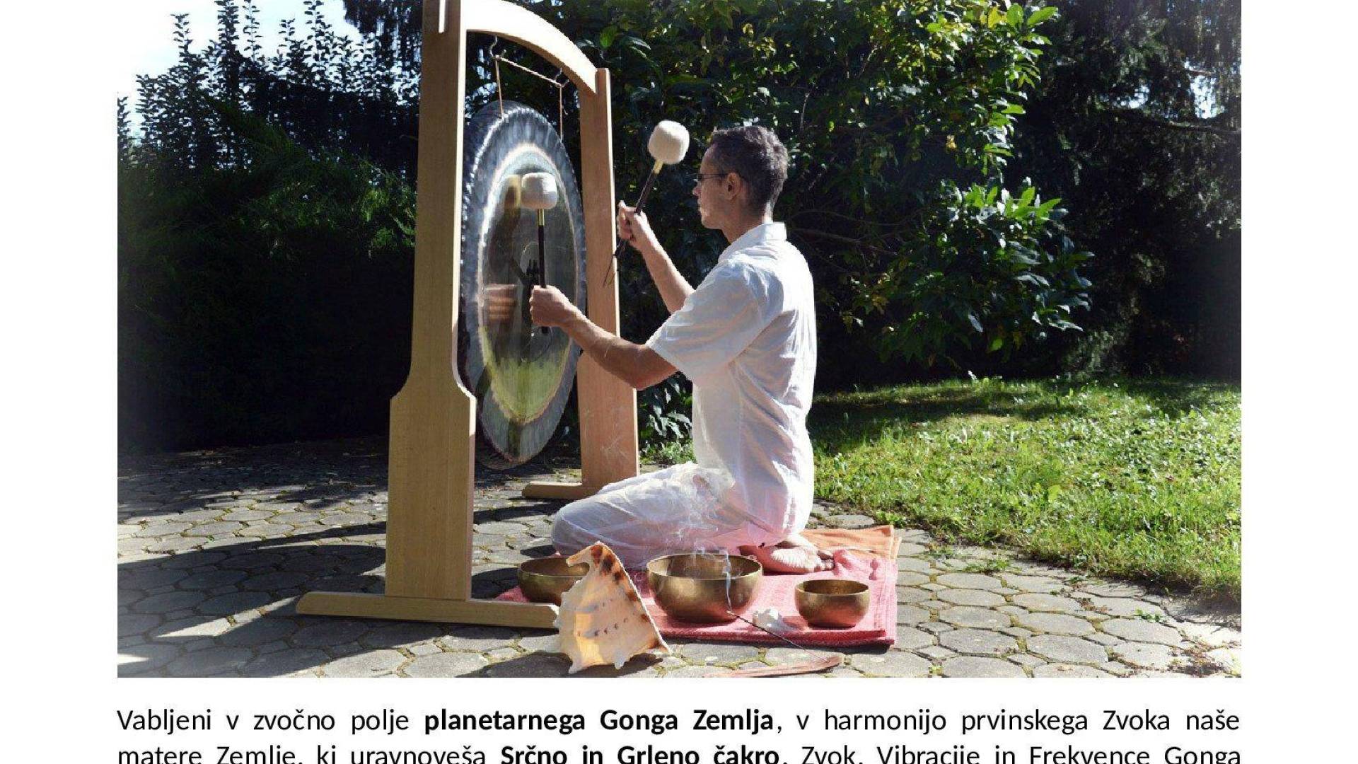 Vabljeni v zvočno polje planetarnega Gonga Zemlja, v harmonijo prvinskega Zvoka naše matere Zemlje, ki uravnoveša Srčno in Grleno čakro. Zvok, Vibracije in Frekvence Gonga Zemlja C# 136.1 Hz krepijo našo sposobnost, da se dobro počutimo v svojem telesu in da opravljamo svoje poslanstvo, ki nam je dano. Ob tem nam zagotavlja vso potrebno ravnovesje. Prizemljitev, povezanost z naravo, obilje, kreativnost, koncentracija, spomin, modrost, izkušnje in opuščanje vsega kar nam ne služi več, so še druge kvalitete, ki jih lahko prejmemo ob prepuščanju temu Gongu. V Zvočni Gong kopeli je pomembna naša namera, ki skupaj z Zvokom daje pravi rezultat. Skozi Zvok Gonga in ostalih prvinskih instrumentov vas bo vodil Aleš Ifko, učenec Gong Mojstra Don Conreauxa iz ZDA. Zvočna Gong kopel poteka leže ali sede. S seboj prinesite vse za udobno doživetje na tleh: podlogo in odejo