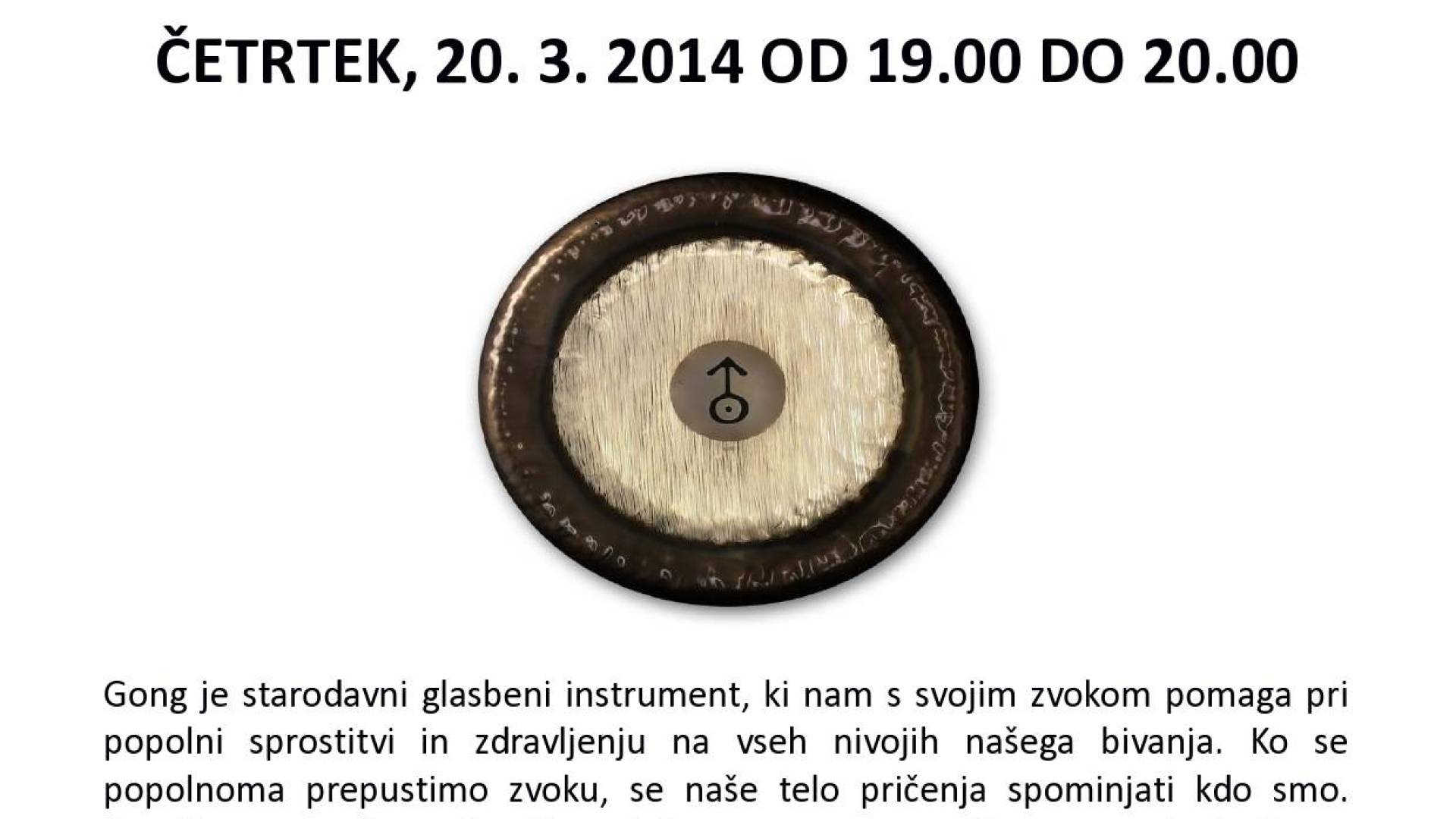 Sofija LendavaGong je starodavni glasbeni instrument, ki nam s svojim zvokom pomaga pri popolni sprostitvi in zdravljenju na vseh nivojih našega bivanja. Ko se popolnoma prepustimo zvoku, se naše telo pričenja spominjati kdo smo. Popelje nas v dimenzijo, kjer ni časa, ne prostora. V tem stanju budnega sanjanja se osvobajamo strahov, negativnih vzorcev, blokad in zastalih energij.