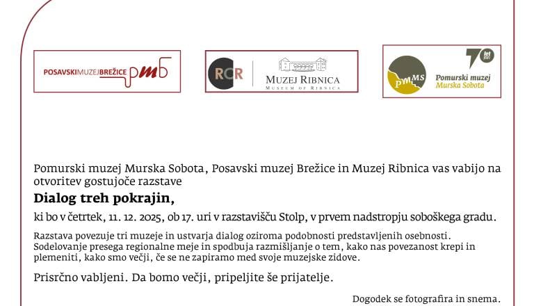 Pomurski muzej Murska Sobota, Posavski muzej Brežice in Muzej Ribnica vas vabijo na otvoritev gostujoče razstave Dialog treh pokrajin. Otvoritev bo v četrtek ...
