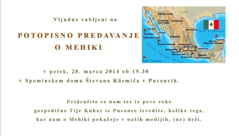 V petek, 28.3. bo v Spominskem domu Števana Kuzmiča v Puconcih potopisno predavanje o Mehiki. Tija Kuhar iz Puconec vam bo iz prve roke predstavila Mehiko.