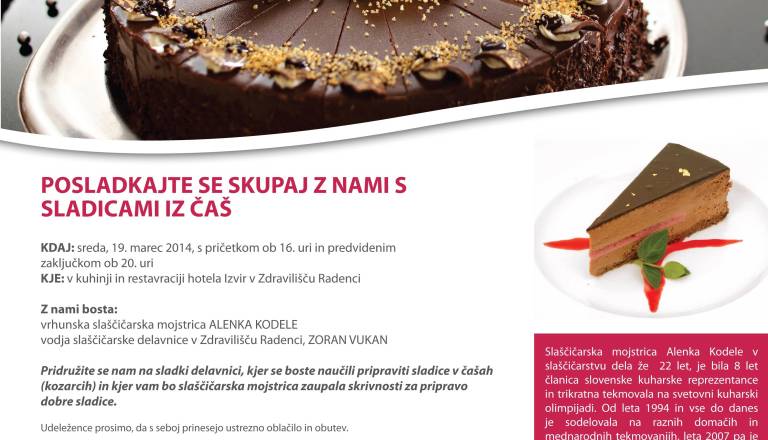 Pridružite se nam na sladki delavnici, kjer se boste naučili pripraviti sladice v čašah (kozarcih) in kjer vam bo slaščičarska mojstrica zaupala skrivnosti za ...