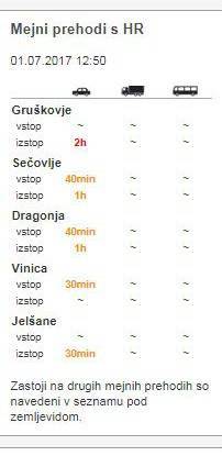 Na mejnih prehodih Dragonja in Sečovlje je za izstop čakalna doba eno uro za vstop pa 40 minut. Krajše čakalne doba so tudi na prehodih Jelšane in Sočerga. Po podatkih prometno-informacijskega centra na mejnem prehodu Petišovci zastojev ni.