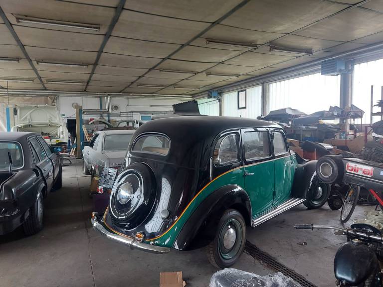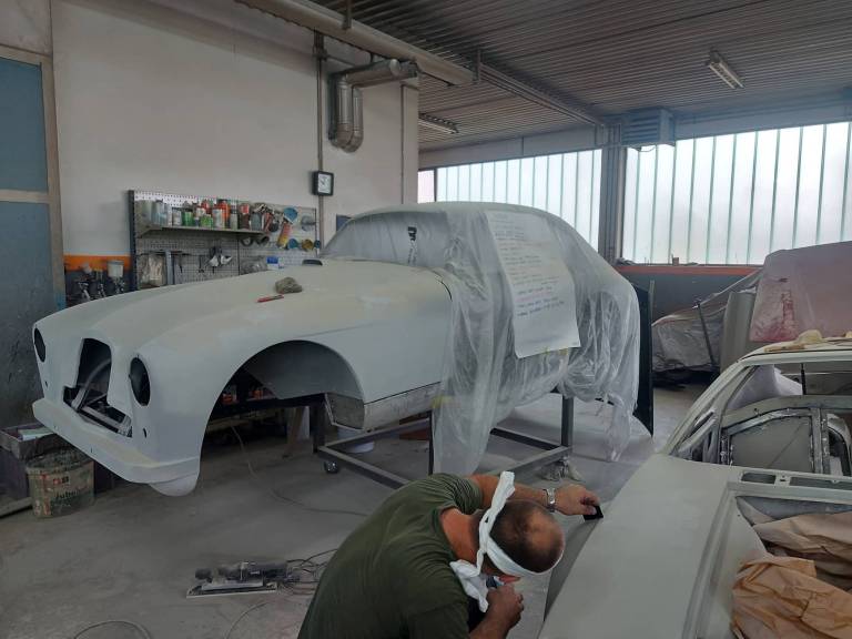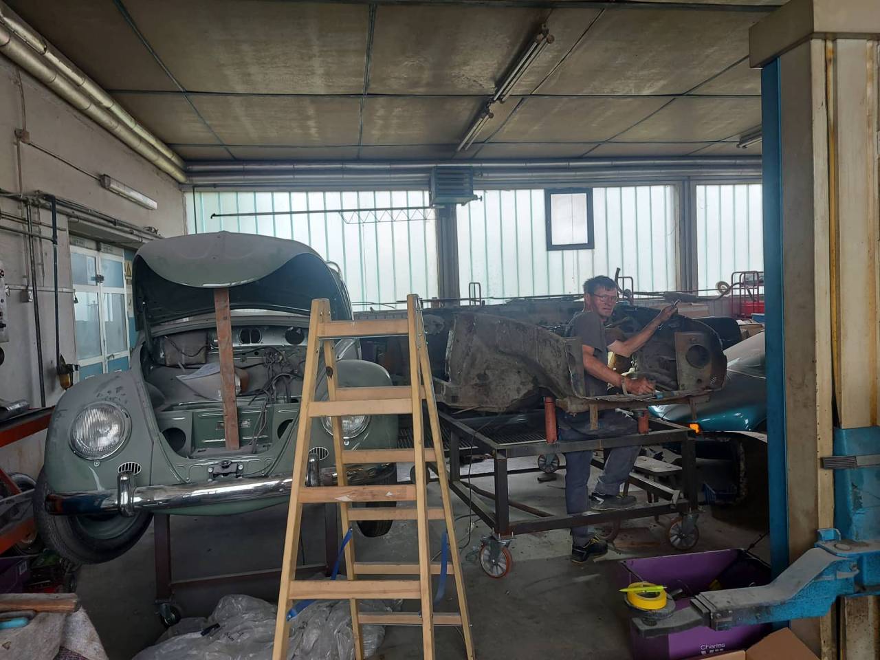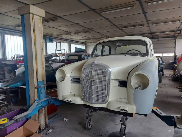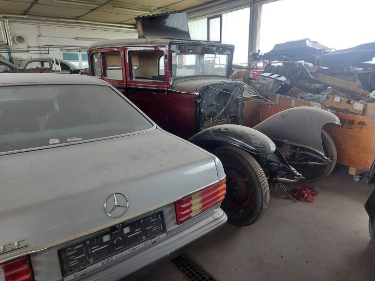 V delavnici imajo preko dvajset vozil starejših modelov, ki čakajo na obnovo - Porscheji, Mercedesi, Volkswagni, Chevroleti in celo Aston Martin DB2 iz leta 1952.