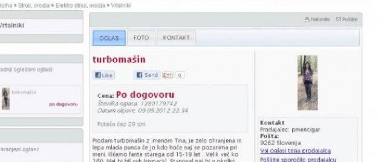 "Prodam turbomašino z imenom Tina, je zelo ohranjena in lepa mlada punca. Če jo kdo hoče, naj se pozanima pri meni. Iščemo fante starega 15-18 let. Velik več ko 160. Naj bi bil suh (sixpack). Stanoval naj bi v okolici Murske Sobote, v večini Goričko. Njegov karakter mora biti prijazen, nežen, zabaven, resna zveza, možnost ogleda, postaven, zanimiv, privlačen."