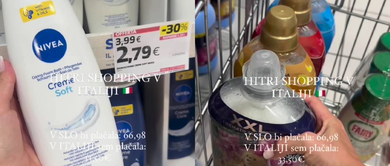 Tam je nakupila nekaj hrane, higienskih pripomočkov in sredstev za čiščenje. Kot je zapisala, bi jo takšen nakup v Sloveniji stal 66,98 evra, medtem ko je v Italiji odštela 33,50 evra.