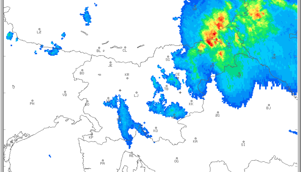 Na radarski sliki padavin je vidno, da se nevihtni sistemi iznad Avstrije pomikajo nad severni in severovzhodni del Slovenije. Kot pravijo na Agenciji RS za okolje (Arso), se morebitne posamezne nevihte na severovzhodu države lahko zavlečejo tudi v noč, spremljal pa jih bo jugovzhodni veter.