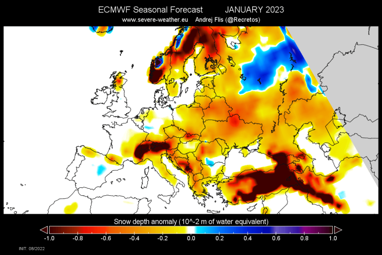 Vremenska napoved kaj več snežnih padavin v osrednji Evropi ne obljublja niti za prvi mesec prihodnjega leta. Praktično vsa osrednja in zahodna Evropa bo deležna podpovprečne količine snežnih padavin.