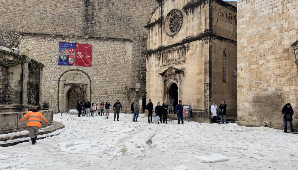 Dubrovnik je danes pobelila toča, ulice starega mestnega jedra pa so zaradi ledu postal drsališče.