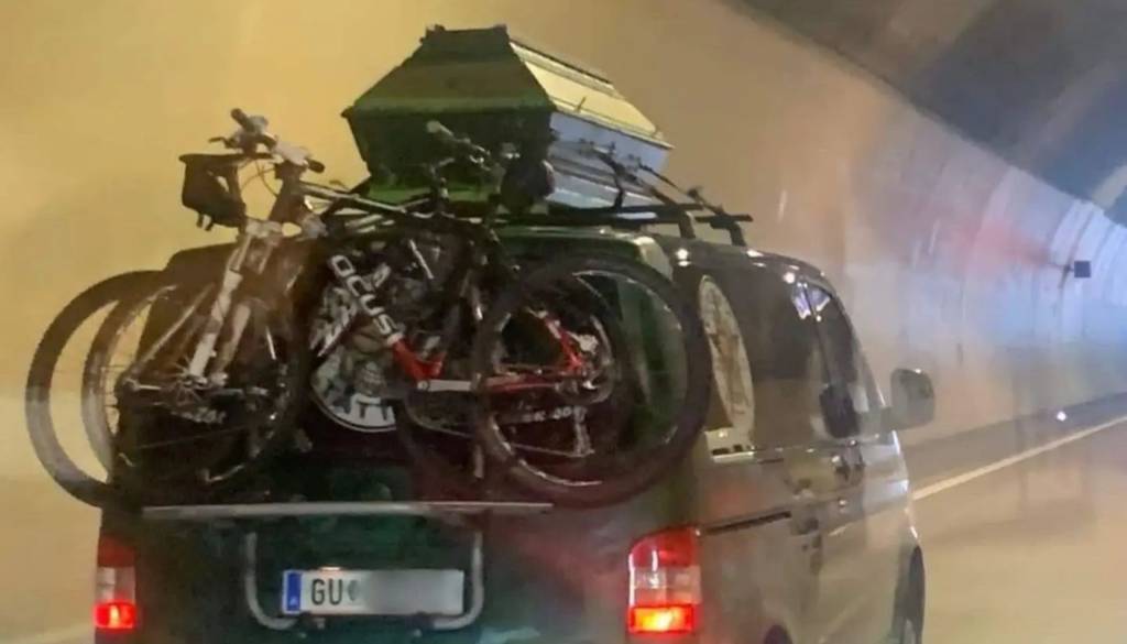 Na fotografiji je vozilo avstrijskih registrskih tablic, na katerega je pripetih več koles, na streho pa je pritrjena kar krsta.
