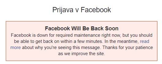 Največje družbeno omrežje Facebook ni dosegljivo oziroma se vanj ni mogoče prijaviti. Že tekom dneva so številni uporabniki poročali o težavah pri objavljanju in komentiranju, okrog 17. ure po slovenskem času pa je Facebook 'zaprl vrata'. Kot pojasnjujejo v zapisu, trenutno potekajo vzdrževalna dela, ki naj bi odpravila napake.