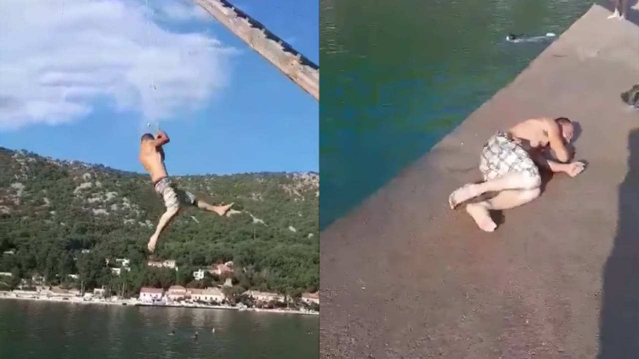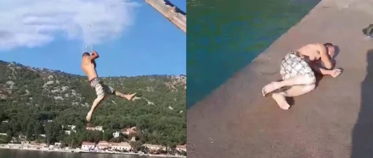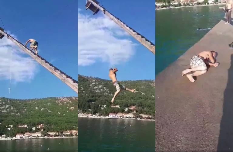 Posnetek prikazuje mlajšega moškega, ki se odloči skočiti v morje z vrvjo, a »zgreši vodo« in pristane na trdem betonu. Posnetek si je mogoče ogledati na tej obarvani povezavi.