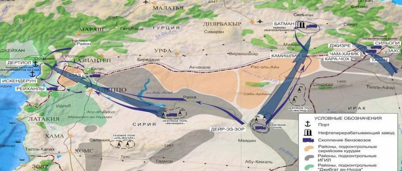 Samooklicana Islamska država se financira pretežno s prodajo nafte, ki jo črpajo na zavzetih naftnih črpališčih v Iraku in Siriji. To nato prodajajo na črnem trgu, po ceni, ki je nekajkrat nižja od uradne cene nafte na svetovnem trgu, s čimer zaslužijo približno 3 milijone dolarjev dnevno, zaradi ruske intervencije pa naj bi se ta znesek sedaj prepolovil. Ob tem se že dalj časa poraja vprašanje, kdo kupuje to nafto in kako lahko take količine nafte nekontrolirano transportirajo iz Iraka in Sirije. To, česar ni uspelo ugotoviti mednarodnim inštitucijam, je po incidentu na sirsko-turški meji razkrilo rusko obrambno ministrstvo, ki je objavilo satelitske posnetke ter posnetke, narejene z brezpilotnimi letali. Ti prikazujejo na stotine tovornjakov, ki nekontrolirano prehajajo mejo med državama. Domnevno naj bi iz ozemlja Sirije v Turčijo prevažali nafto.