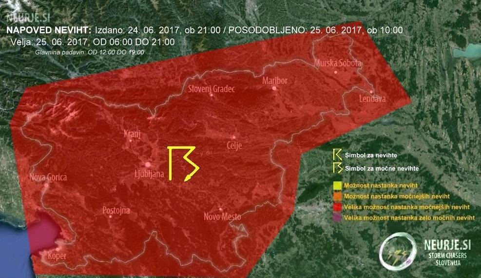 Nedelja bo zelo pestra in nevarna. Popoldan bo Slovenijo od severozahoda prešla vremenska fronta, ki bo glavni razlog za zelo burno dogajanje po vsej Sloveniji. Glede na izračune meteoroloških modelov WRF-ARW in dejavnike, ki vplivajo na razvoj, rast in moč nevihtnih sistemov, je za nedeljo za celotno Slovenijo napovedana velika možnost močnejših neviht.