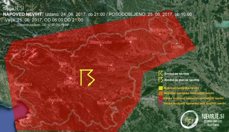 Neurja bodo lokalno spremljali zelo močni nalivi, zaradi katerih je na lokalnih območjih pričakovati težave s hudourniškimi vodotoki ter poplavljanjem cest in objektov.