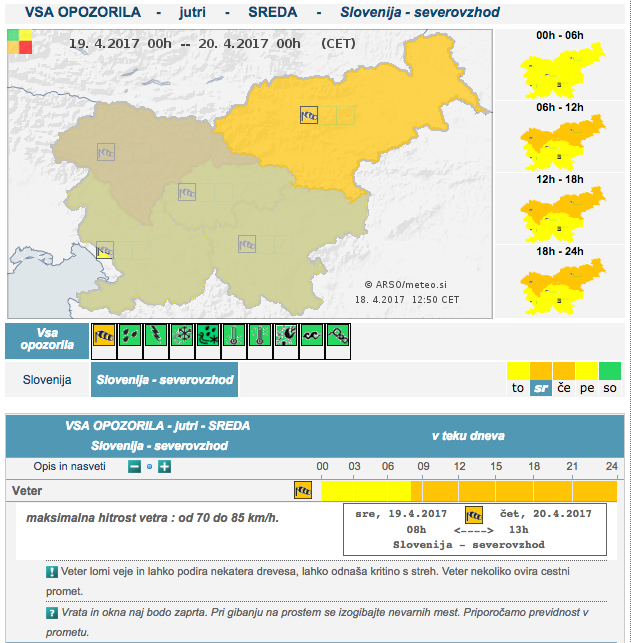 Kot so opozorili na Agenciji RS za okolje, bodo najmočnejši sunki vetra predvidoma v zgornjem Posočju, pod Karavankami in na severovzhodu države. Nad okoli 700 metri nadmorske višine pa bodo sunki lahko presegli 100 kilometrov na uro. Z okrepljenim severovzhodnim vetrom doteka nad naše kraje zelo hladen in občasno bolj vlažen zrak.