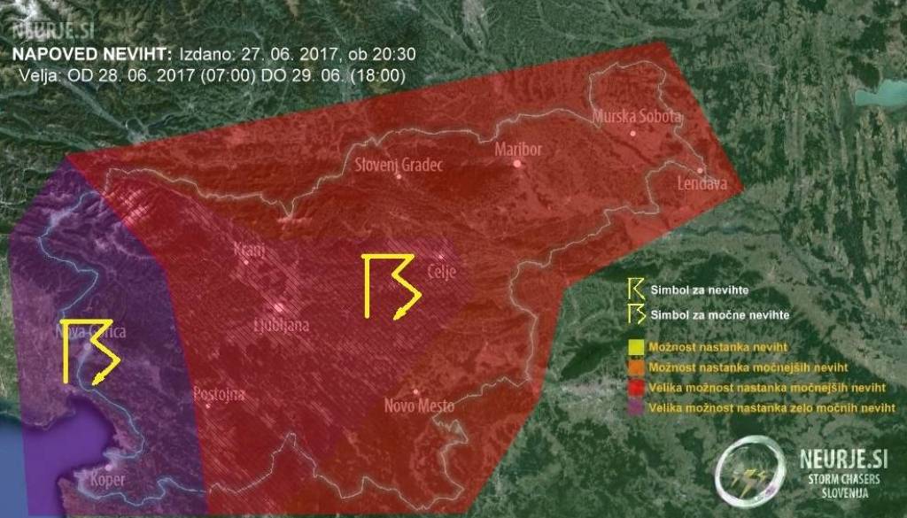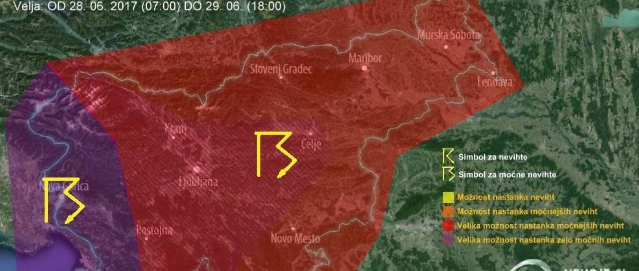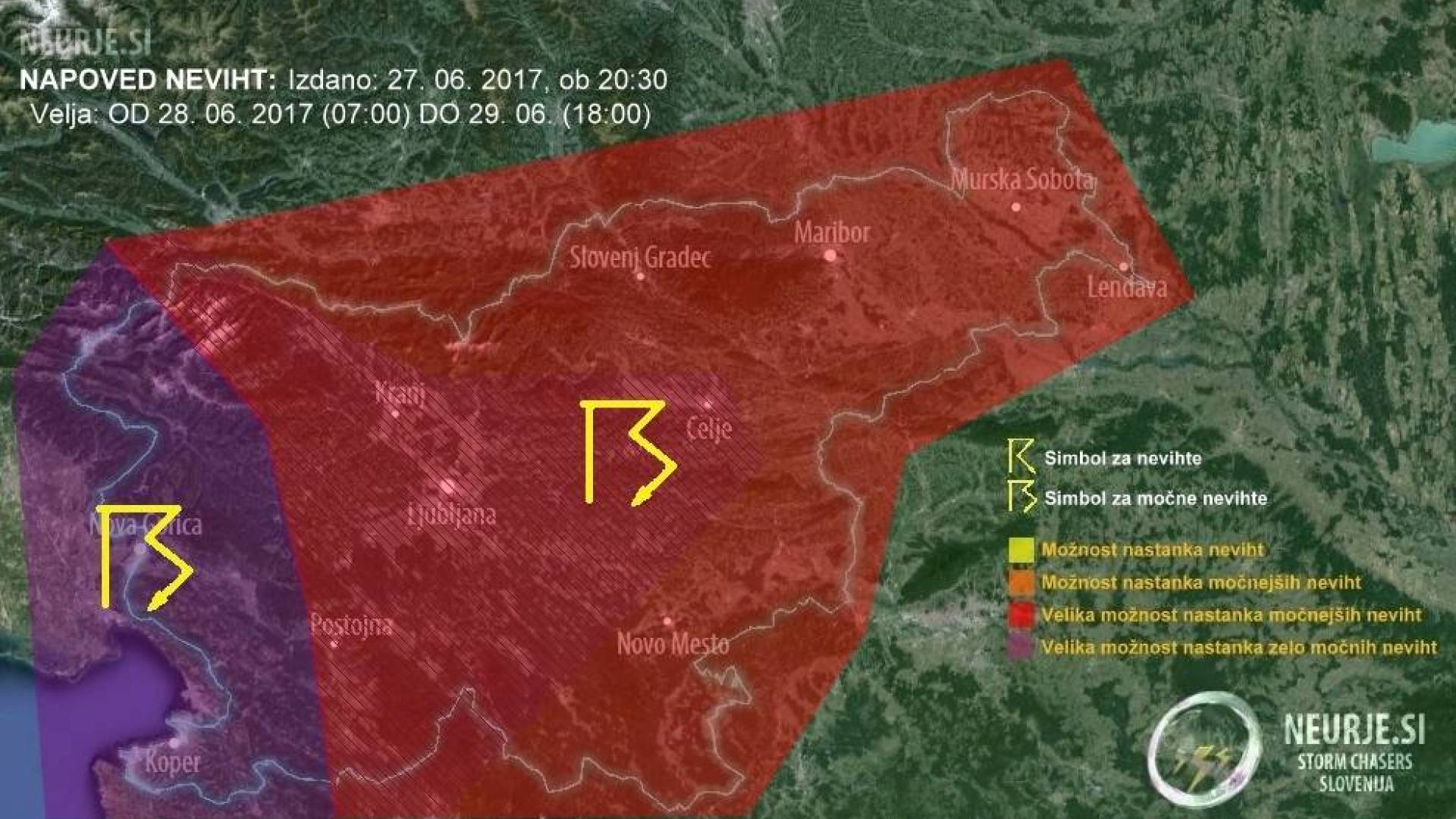 Za zahodno Slovenijo so na Neurje.si izdali najvišjo stopnjo nevarnosti, tam bodo neurja predvidoma najmočnejša. Za ostali del Slovenije je izdana 2. stopnja nevarnosti. Izpostavljeno je še območje osrednje Slovenije z Notranjsko in Gorenjsko, kjer bo nevarnost silovitih sunkov vetra največja.