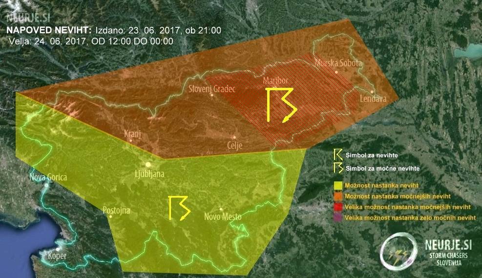 Na severu in severovzhodu države bodo zvečer krajevno možna močna neurja s točo, silovitimi sunki vetra in nalivi, piše Neurje.si. Nevihte bodo spremljali tudi številni udari strel. Toča lahko na teh območjih v premeru preseže tri centimetre.