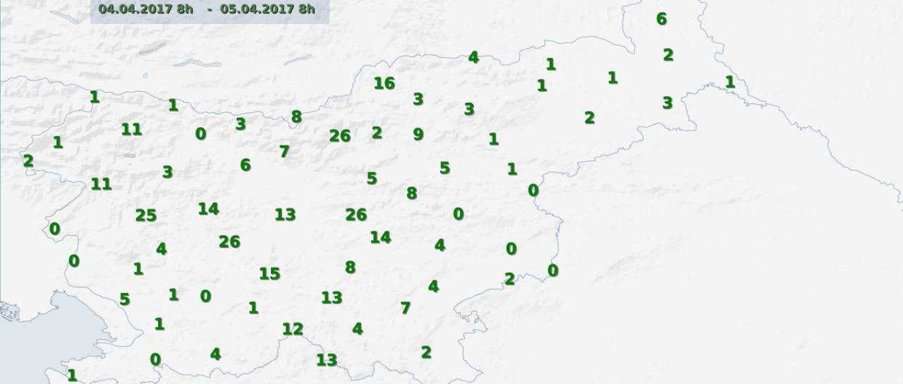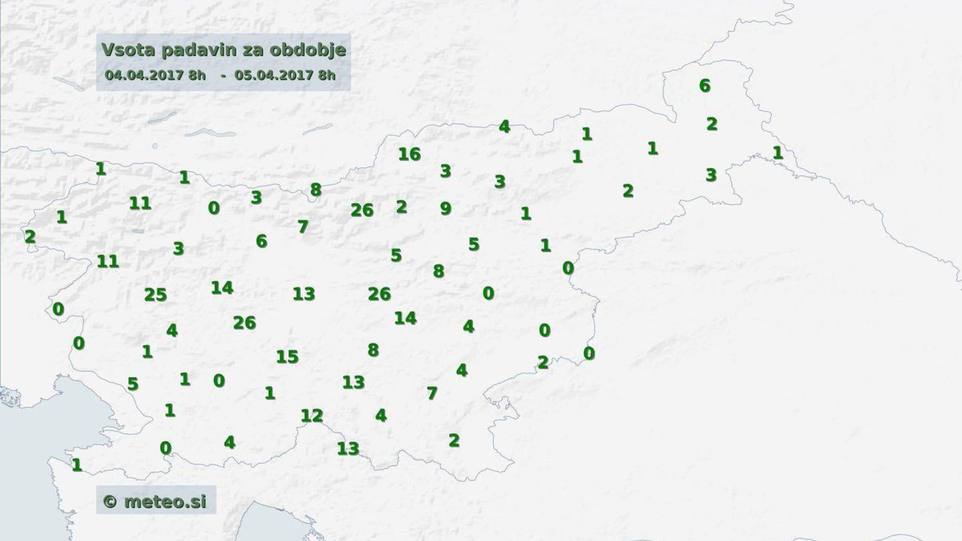 Podatki državne meteorološke službe Agencije Republike Slovenije za okolje so namreč pokazali, da je v preteklih 24 urah največ dežja padlo v osrednji Sloveniji, najmanj pa prav na skrajnem zahodu in vzhodu države.
