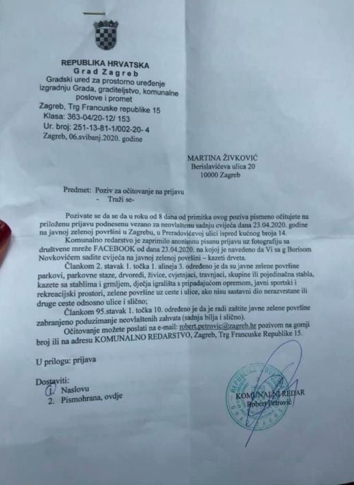 Prijavila jo je ena od sosedov, ker je skupaj s prijateljem Borisom Novkovićem okrasila del javne površine v Preradovićevi ulici.