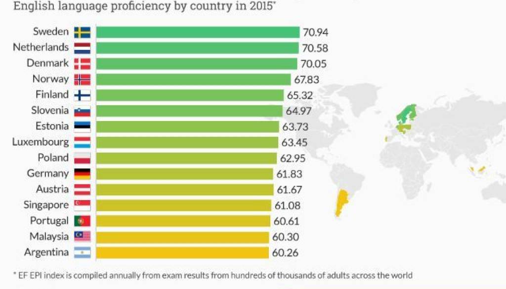 Na lestvici je razvrščenih 15 držav, ki imajo največji delež prebivalstva, ki govori angleščino kot tuji jezik. Države, v katerih je angleščina uradni jezik so izvzete. Na lestvici se je Slovenija uvrstila na visoko 6. mesto, kar je najvišje mesto med slovanskimi državami. Angleščino v Sloveniji obvladata skoraj dve tretjini celotnega prebivalstva, na Švedskem, ki je na prvem mestu, pa angleško govori skoraj 71% prebivalstva.