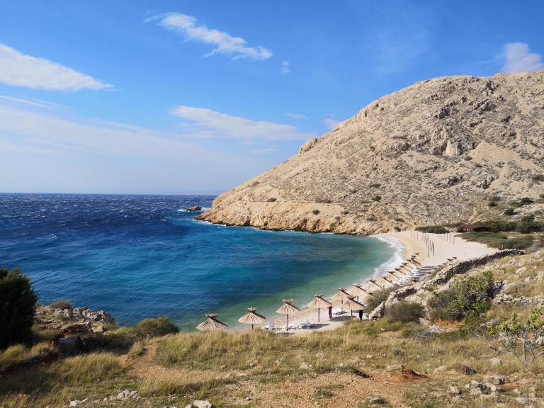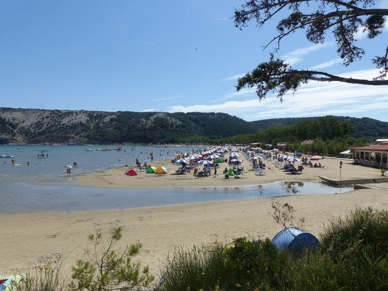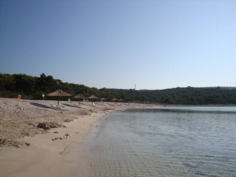 Ta rajska oaza se nahaja na Dugem otoku, enem od najdaljših hrvaških otokov. Plaža se nahaja v majhni uvali na severnem delu otoka in se razprostira na 800 metrih dolžine. Je precej plitka - če se odpravite 250 metrov od obale, globina morja ne bo presegla 3,5 metra, kar so idealni pogoji, če ste na dopustu z otroki. Okolica plaže je poraščena z borovimi gozdovi, senco pa lahko poiščete pod enim od številnih slamnatih senčnikov.
