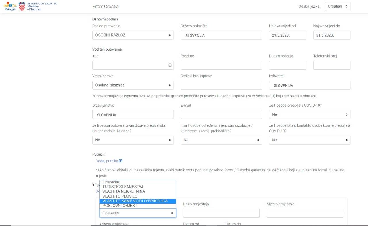 Poleg osebnih podatkov potnikov, je potrebno vnesti tudi podatke o nastanitvi v času bivanja na Hrvaškem.