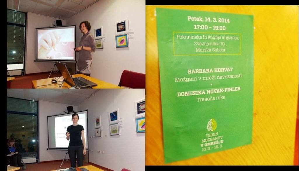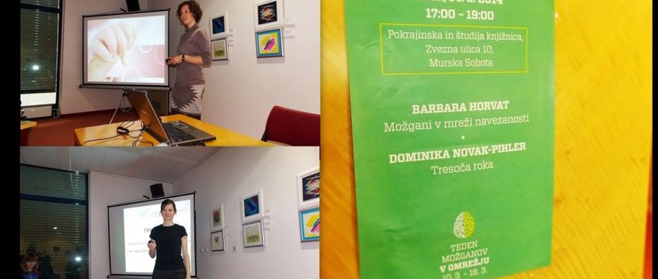 V soboški knjižnici smo včeraj, 14. marca, lahko poslušali predavanji Barbare Horvat, psihologinje, ki dela na Univerzitetnem rehabilitacijskem inštitutu Soča in Dominike Novak - Pihler, nevrologinje, ki se največ ukvarja z epilepsijo. Organizacija in koordinacija dogodka v Murski Soboti je v rokah Tamare Repić, ki se že tri leta trudi, da se teden možganov odvija tudi v Murski Soboti.