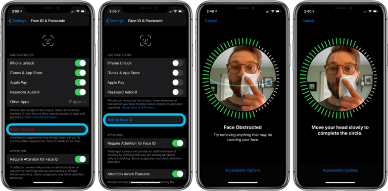 - Če na vašem iPhoneu piše »Face Obstructed«, masko počasi odmaknite od sredine obraza, dokler vas nastavitev ne prosi, da »počasi premikate glavo, da dokončate krog« (ang. Move your head slowly to complete the circle)