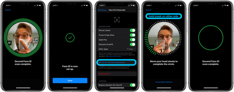 Pri tem pa portal 9to5Mac priporoča, da v funkciji Face ID, uporabnik namesti masko na eno polovico obraza, potem pa nastavi masko še na drugo polovico znotraj funkcije 'nadomestni videz' (ang. Set Up Alternate Appearance).