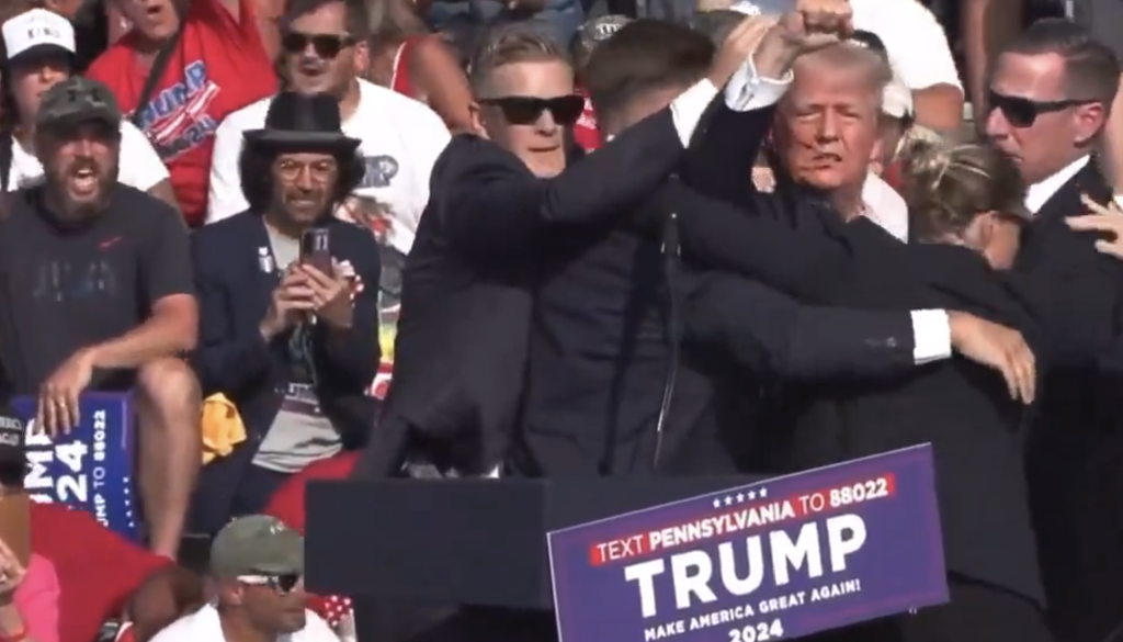 Trump je med govorom slišal več glasnih pokov. Padel je na tla, ob tem pa ga je nemudoma zaščitila njegova varnostna ekipa. Nekaj trenutkov kasneje se je Trump dvignil in dvignil pest v zrak. Nato so ga pospremili do njegovega voznega parka.