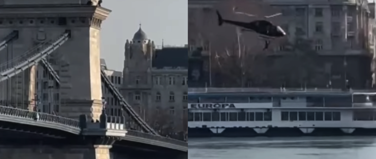 Na posnetkih je vidno, kako helikopter lebdi nizko nad mostom, na njega skoči moški, helikopter pa z visečim moškim odleti.