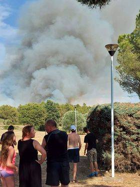 V bližini turističnih naselij v Umagu je danes popoldan zagorelo. Po besedah gasilskega poveljnika istrske županije Dina Kozlevca gori borov gozd, objekti pa trenutno niso ogroženi.