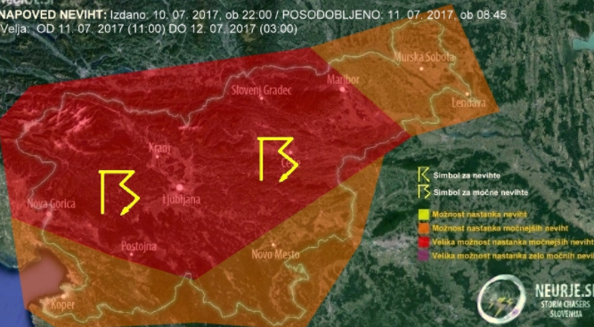 Glavno dogajanje je pričakovati zvečer, ko se bodo nevihte, vmes tudi močnejša neurja, iz smeri Avstrije in Italije okrepile in se v obliki večjega nevihtnega sistema v prvem delu noči širile proti jugovzhodu države.