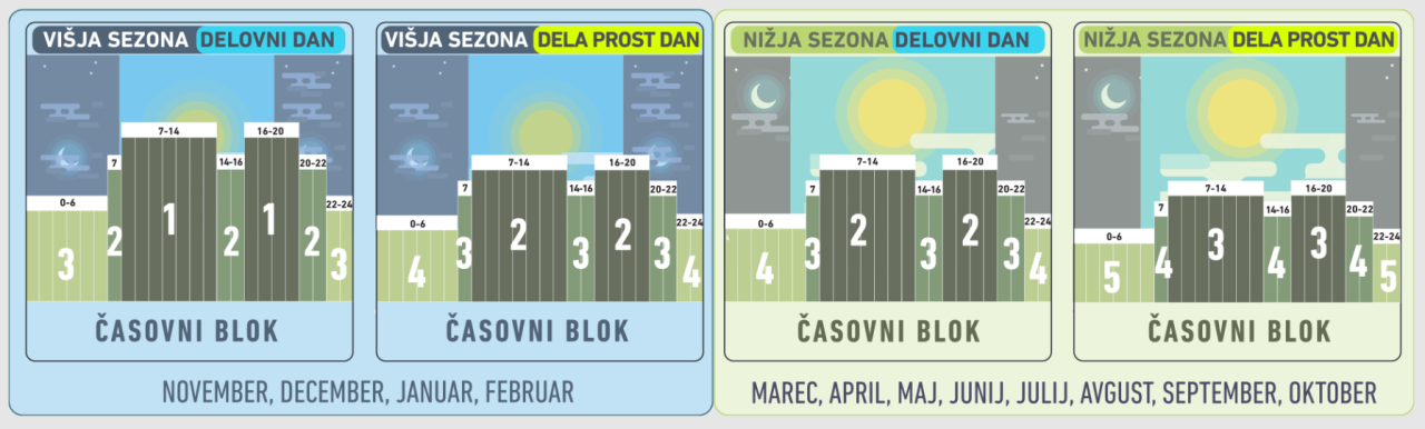 Višja sezona bo veljala med novembrom in februarjem, medtem ko bo nižja sezona v preostalih mesecih. Časovnih blokov je pet, znotraj posameznega dneva pa so trije, ločeni glede na delovne dni in dela proste dni.
