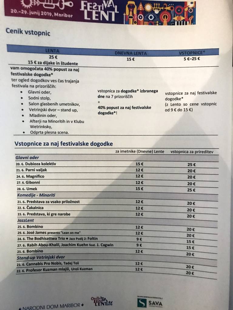 Vstopnica Lenta obiskovalcem festivala za 25 evrov (dijaki in študenti 15 evrov) zagotovi popolno doživetje desetih festivalskih dni na sedmih festivalski prizoriščih z več kot petdesetimi prireditvami. Na voljo je tudi dnevna Lenta, ki prinaša enake ugodnosti, zanjo pa je potrebno odšteti 15 evrov.