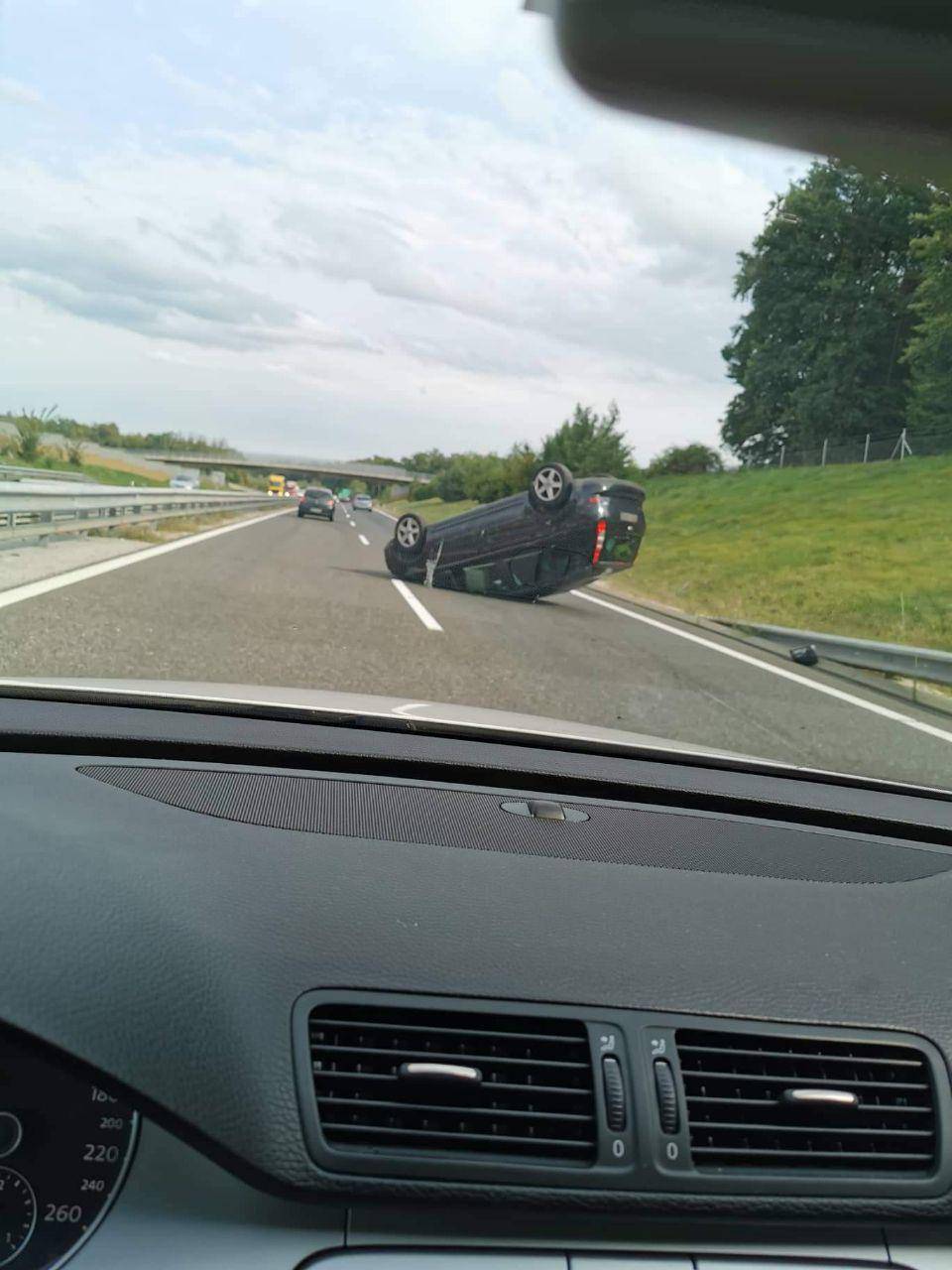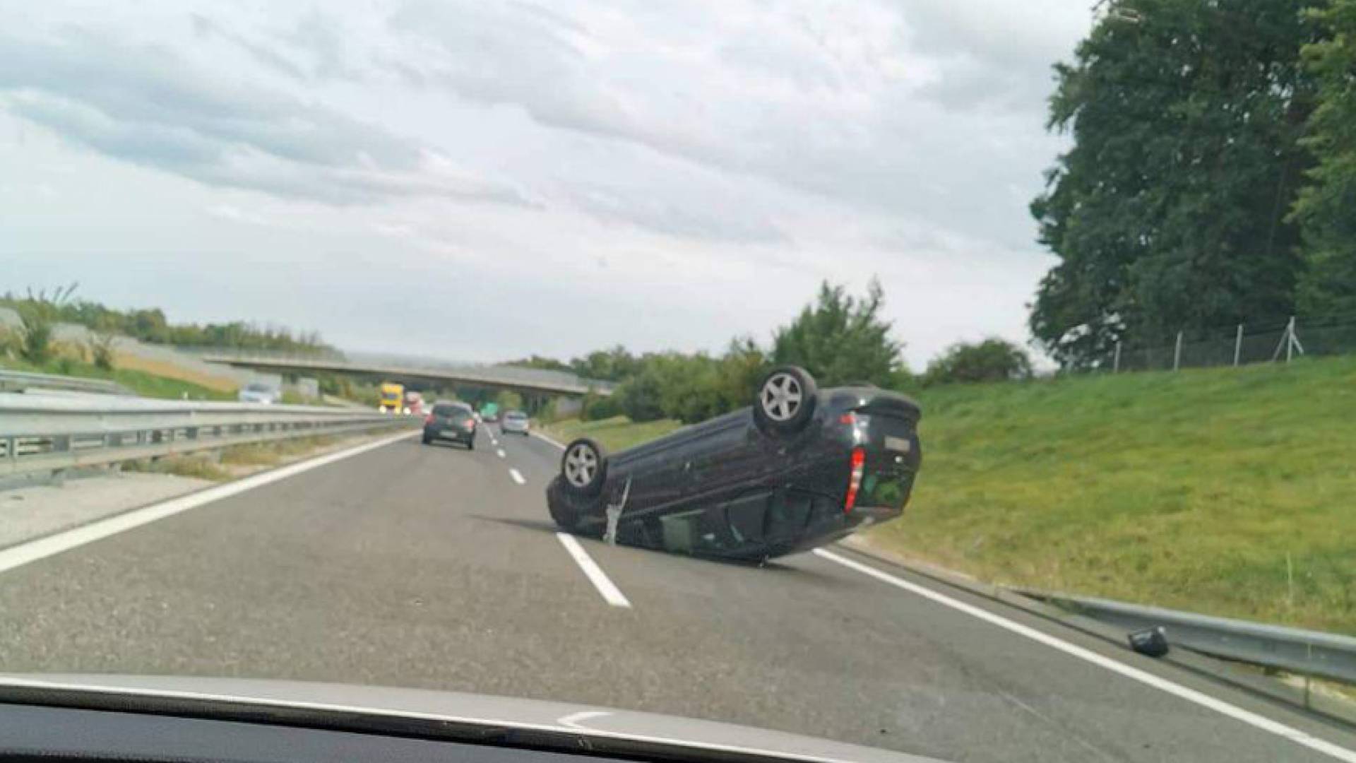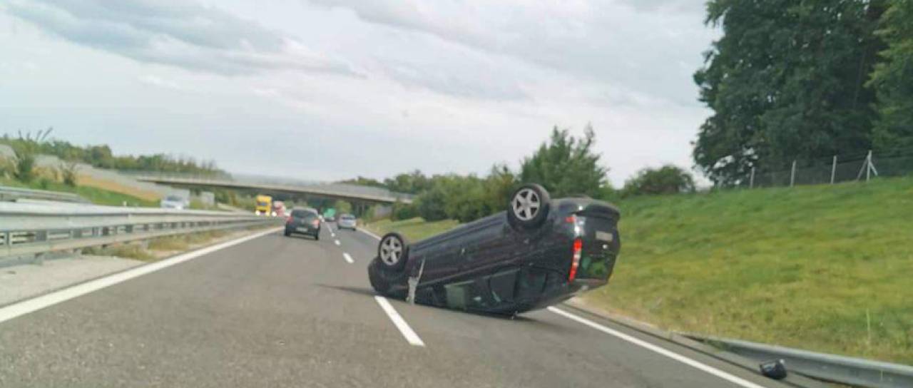 V trčenju na avtocesti se je na strehi sredi voznega pasu znašlo osebno vozilo.