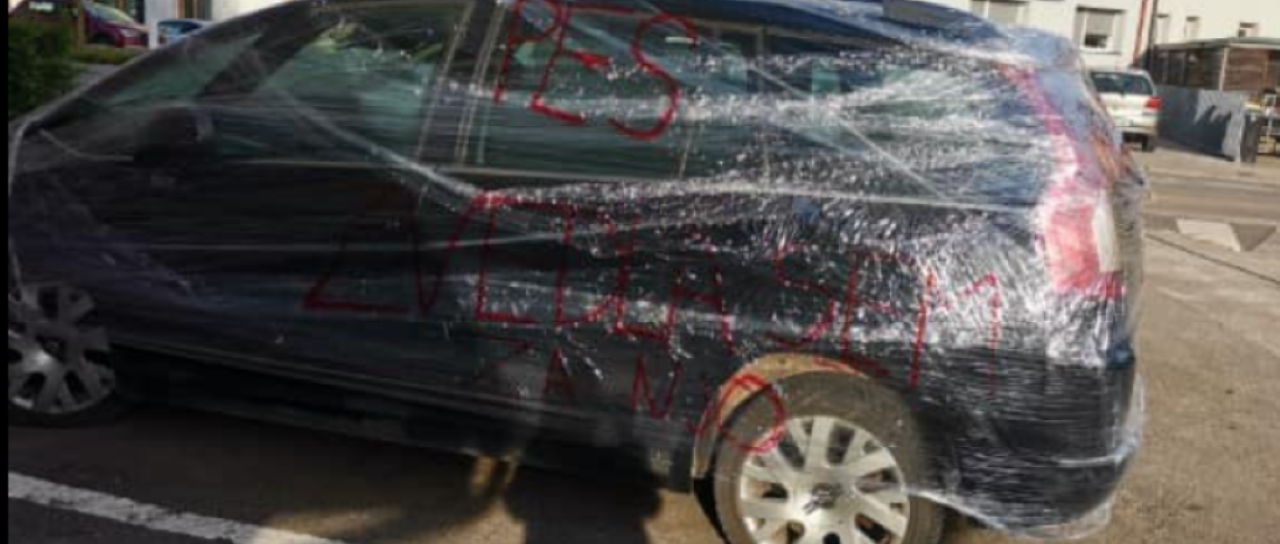 Na družabnih omrežjih so se je danes pojavile fotografije avtomobila, ovitega v prozorno plastično folijo, na njem pa sporočilo o nosečnosti ter nekaj bolj nesramnih in nevljudnih besed.