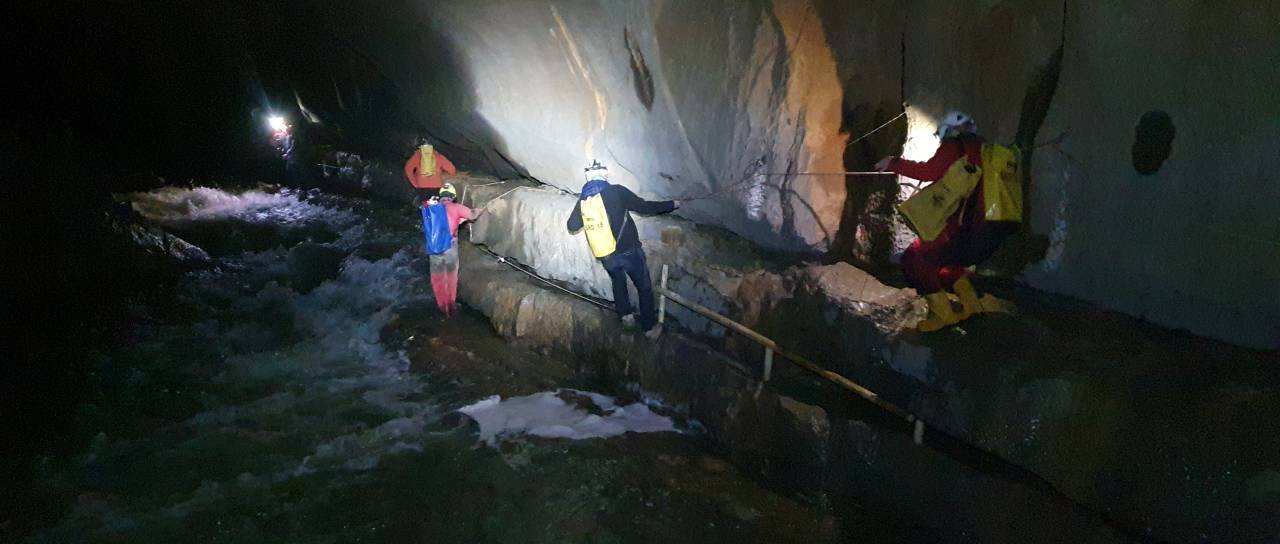 Po tistem, ko se tričlanska družina in vodnika v soboto zaradi dviga gladine vode niso mogli vrniti iz Križne jame, je že popoldne stekla reševalna akcija.