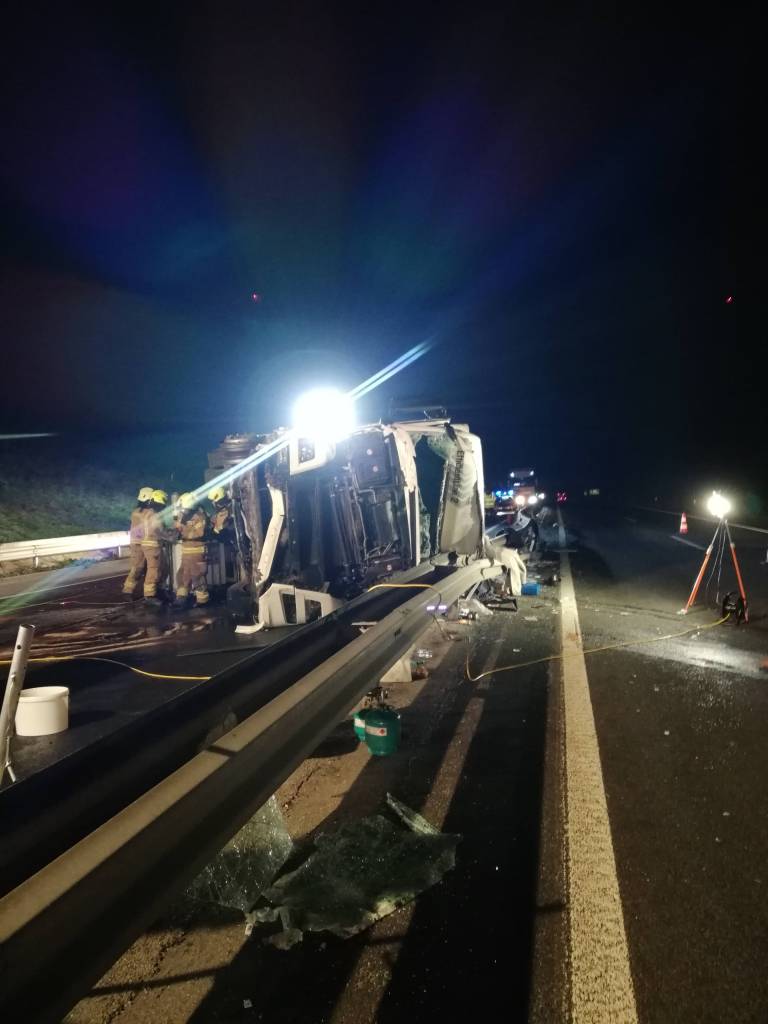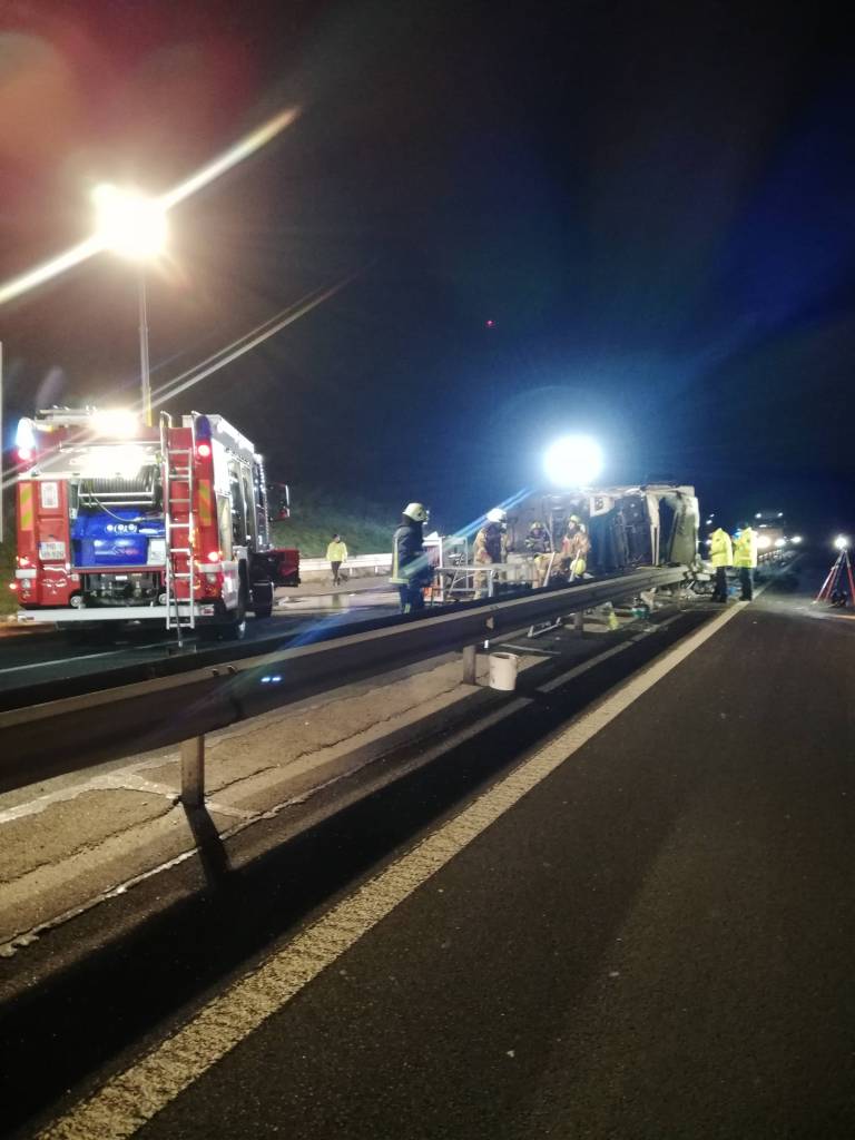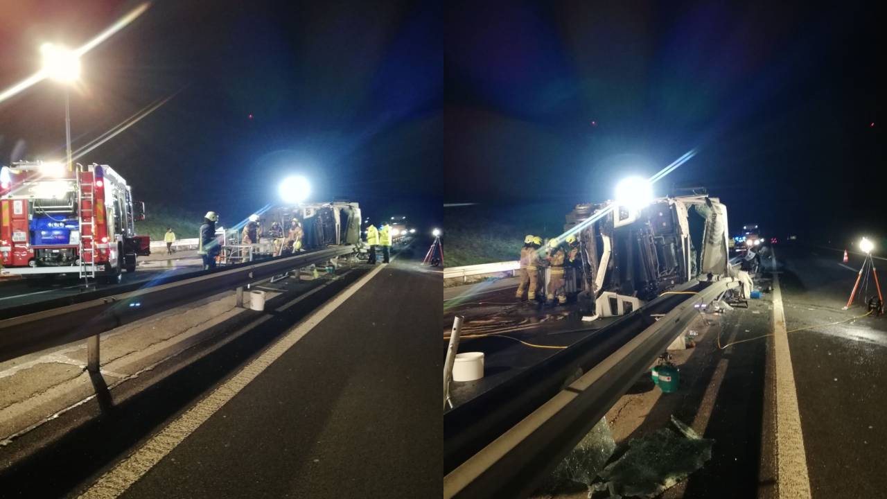 Po podatkih Uprave Republike Slovenije za zaščito in reševanje je ob 2.43 na avtocesti med izvozoma Slovenska Bistrica sever in jug, občina Slovenska Bistrica, tovorno vozilo trčilo v odbojno ograjo in se prevrnilo na bok.