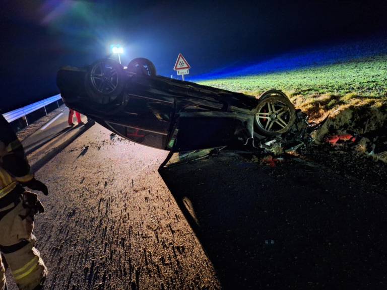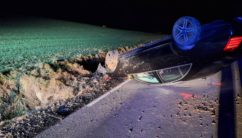 Prometna nesreča med Krašči in Ropočo. Z vozilom na streho, cesta je bila zaprta.