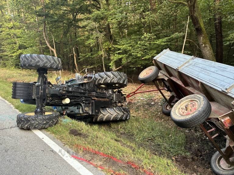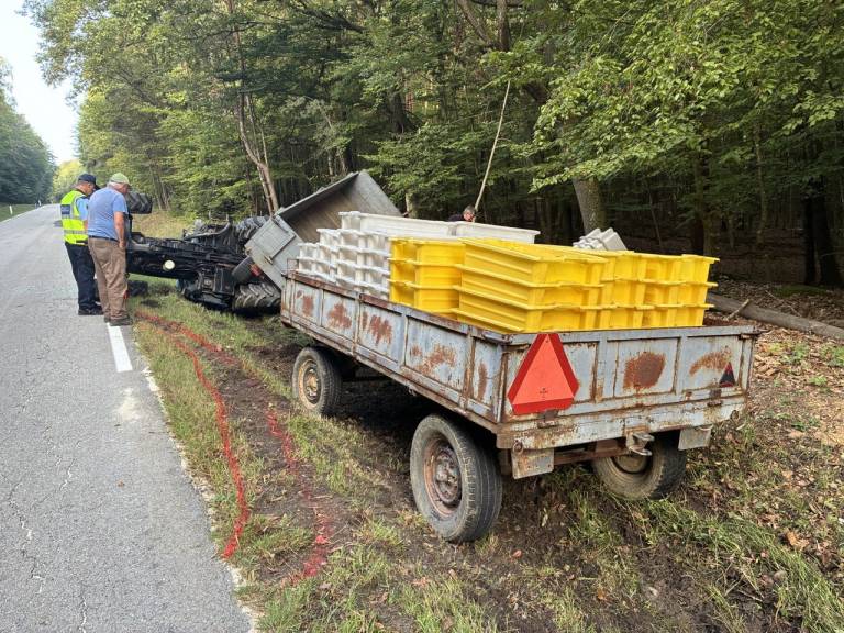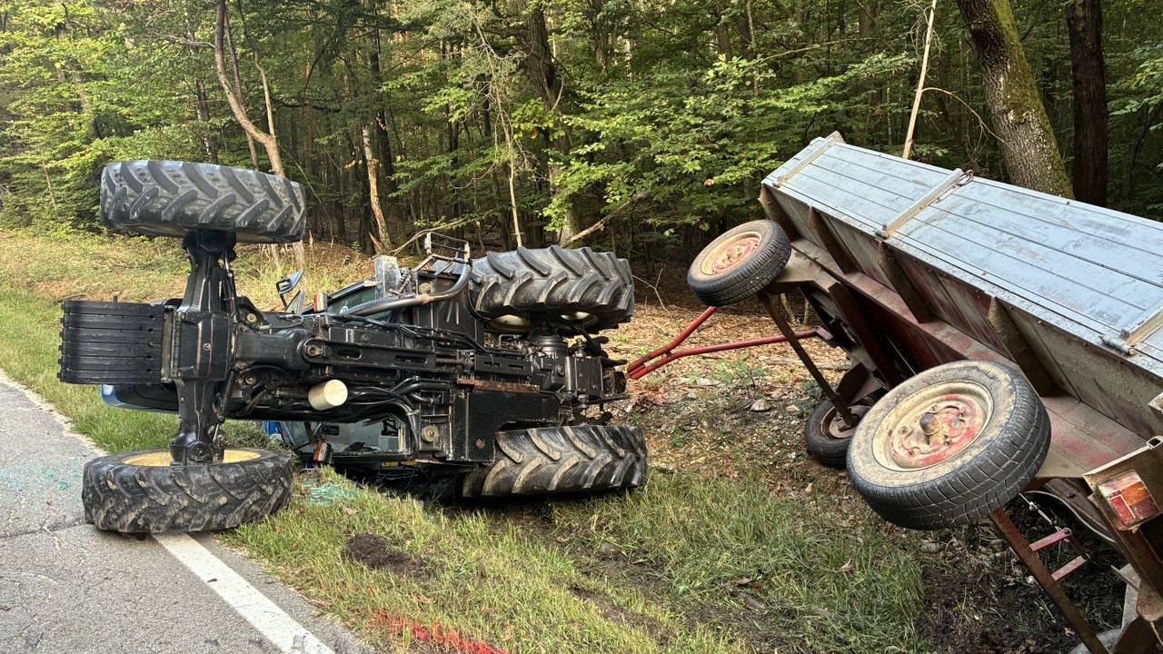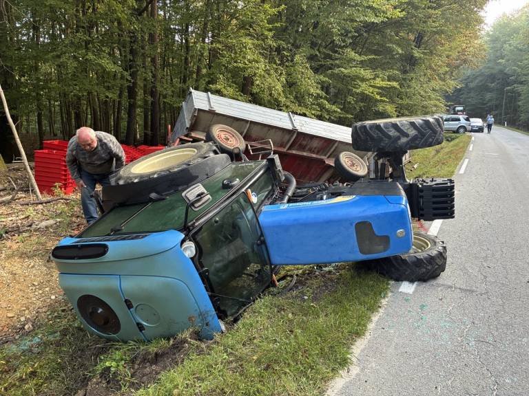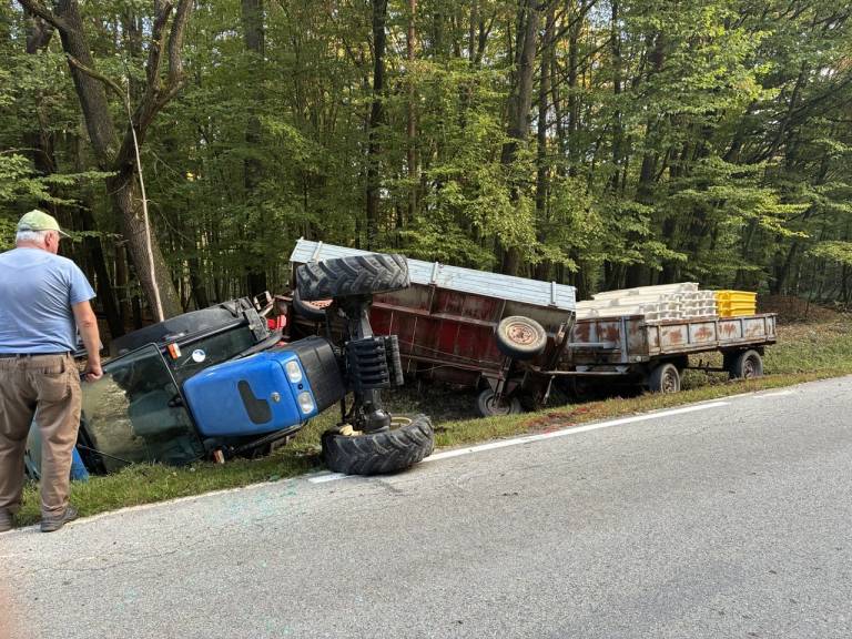 Po prvih informacijah s terena je voznik traktorja s prikolico prevrnjen pristal v jarku.
