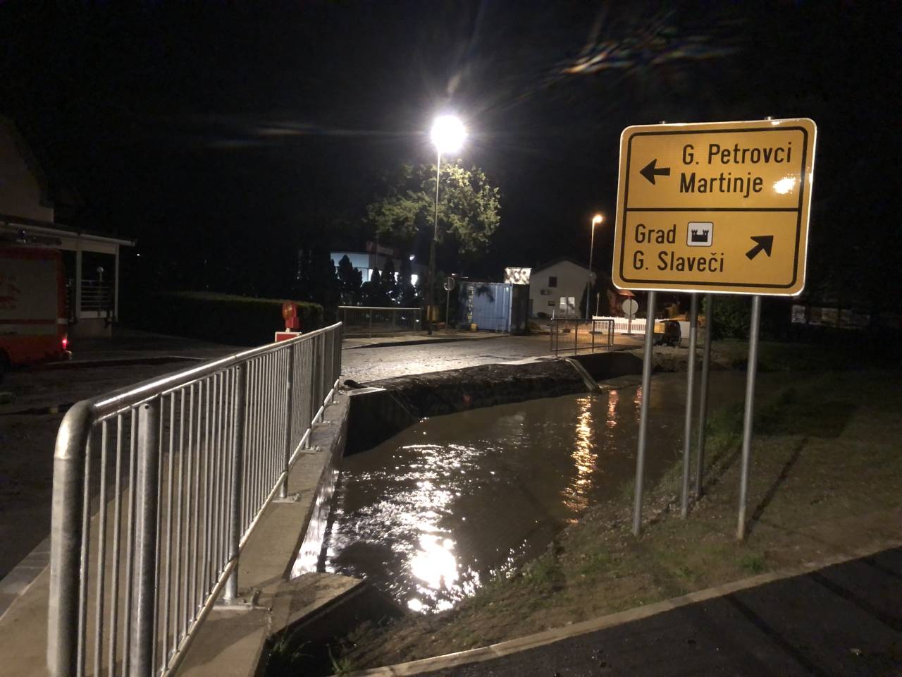 V Kuzmi je meterorna voda zalila nekaj kleti in poplavila cesto.