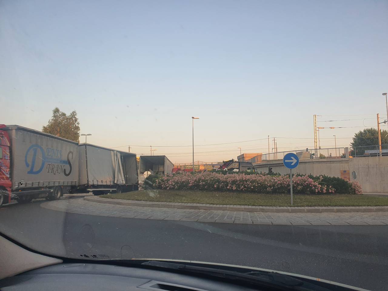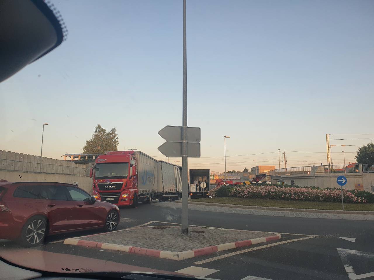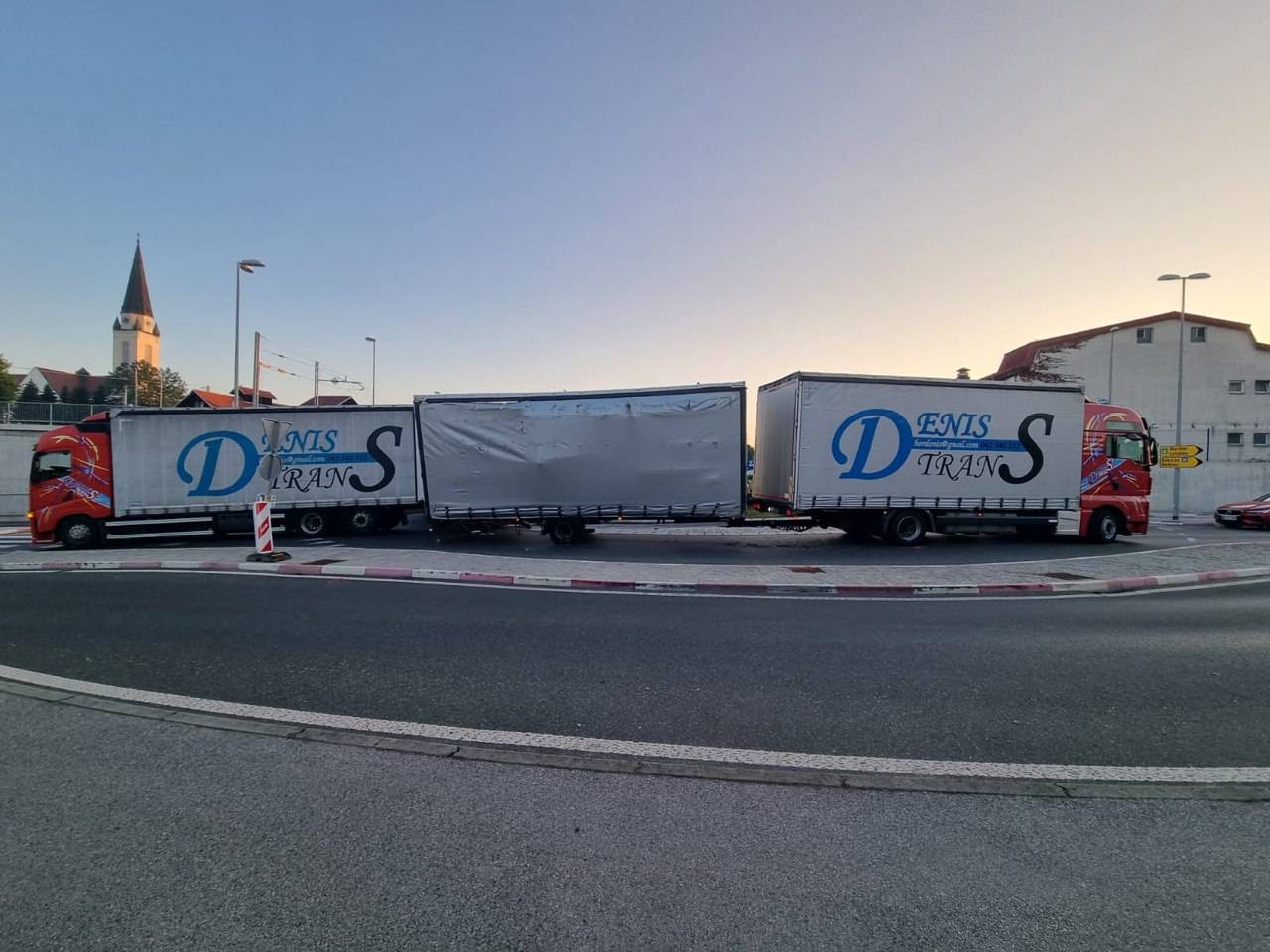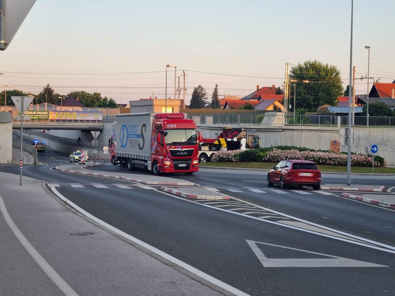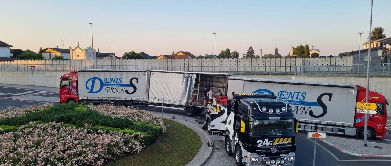 V krožišču voznik ni prilagodil hitrosti, priklopno vozilo se je prevrnilo na desni bok, ter obstalo v krožišču. V prometni nesreči je nastalo za okoli 20.000 evrov škode.