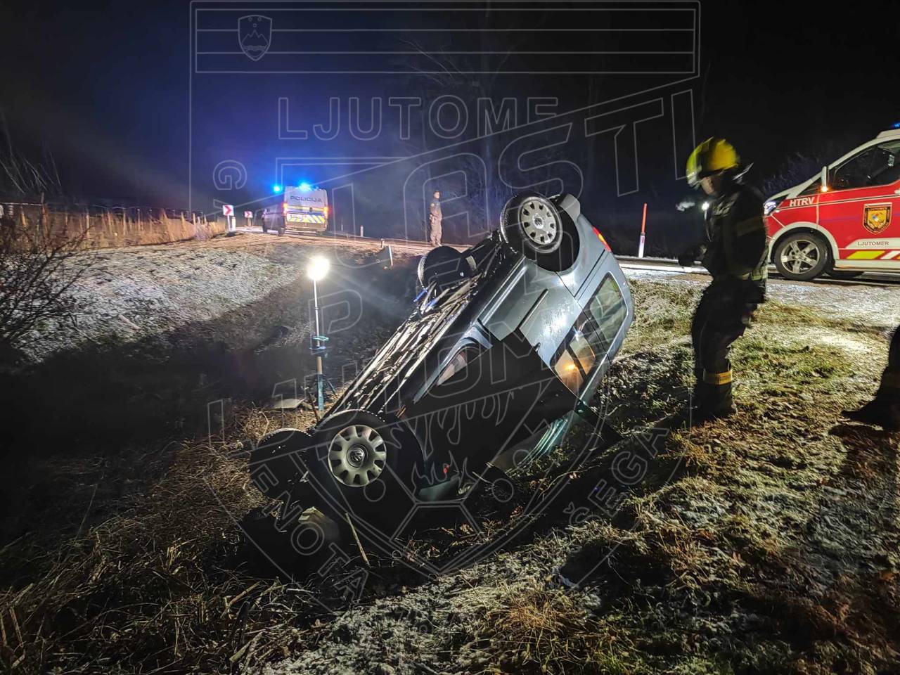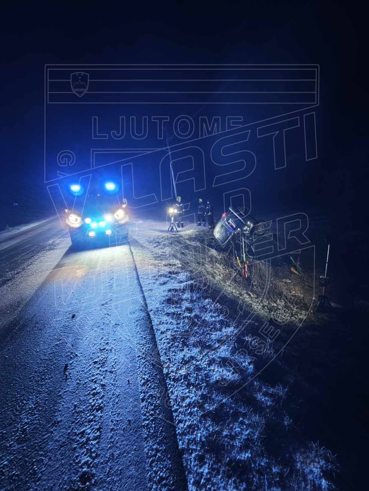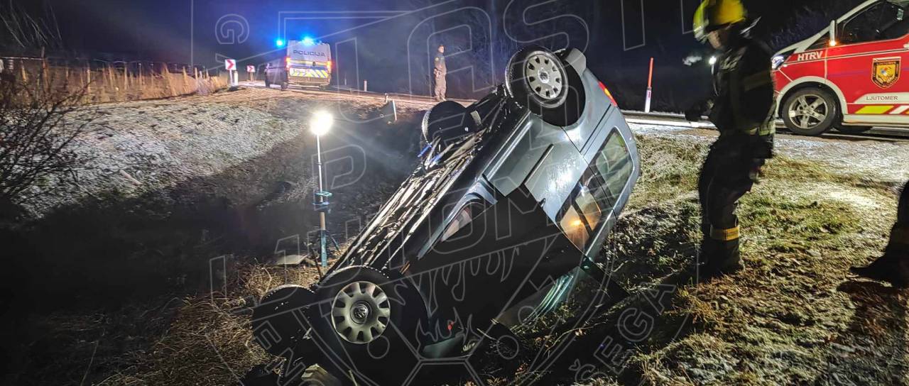 Uprava Republike Slovenije za zaščito in reševanje poroča, da je danes zgodaj zjutraj, ob 4.53, na cesti Stročja vas - Veščica, občina Ljutomer, osebno vozilo zapeljalo s cestišča in se prevrnilo na streho.