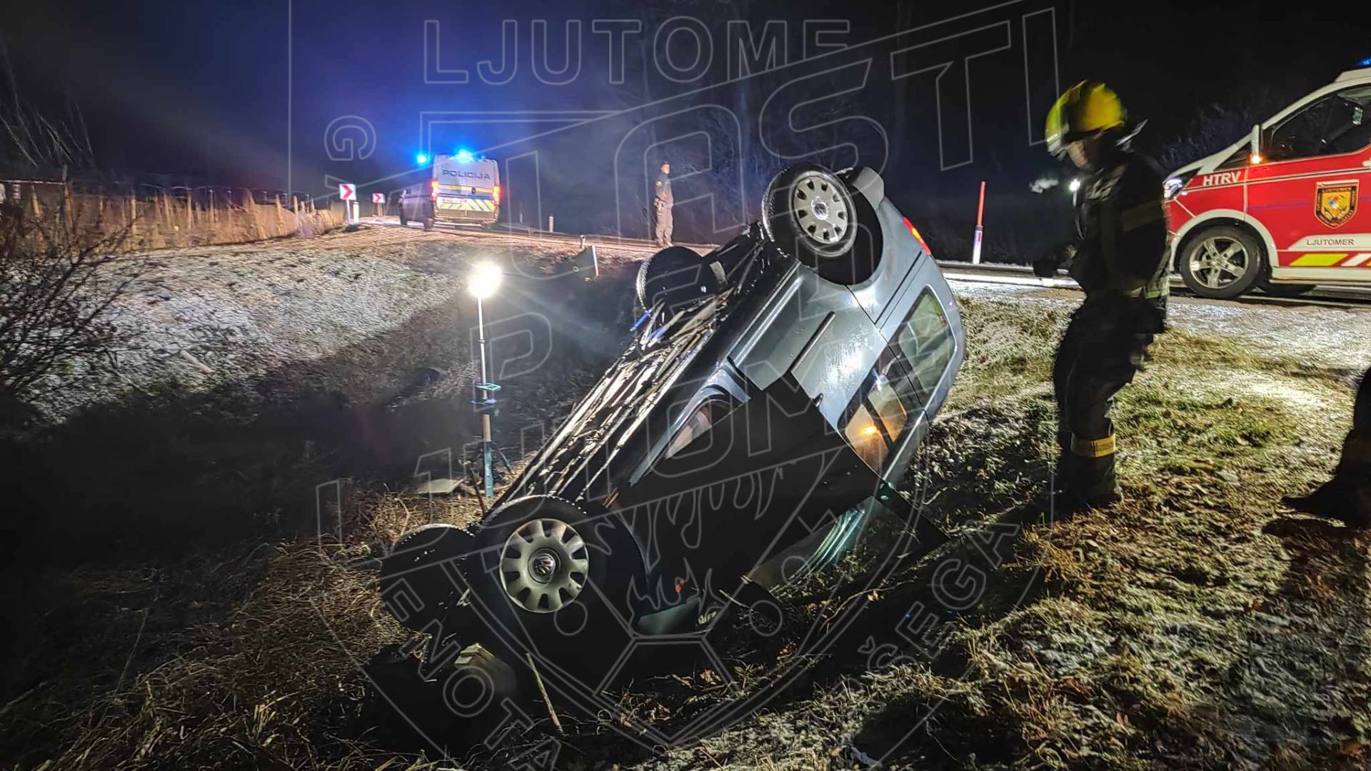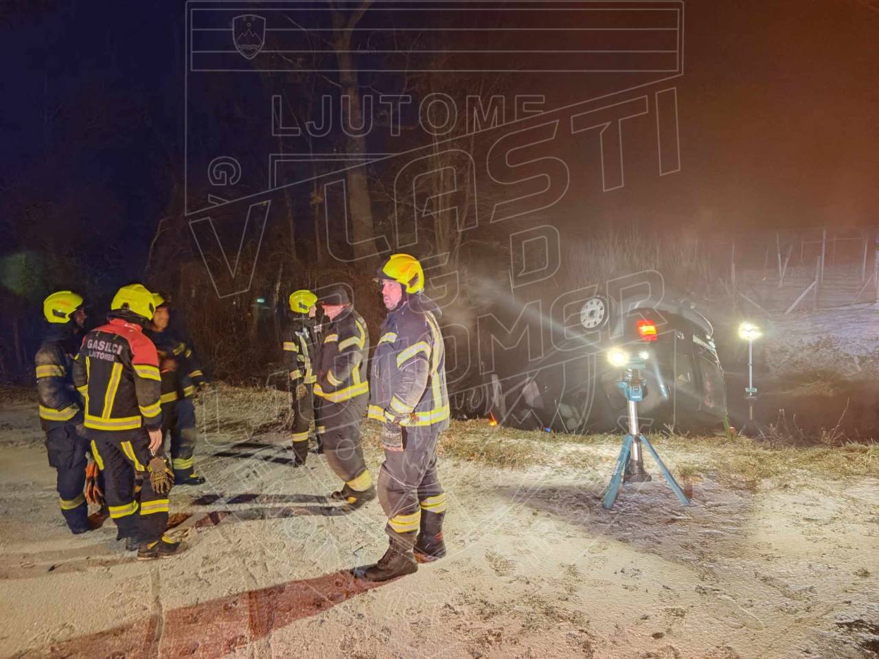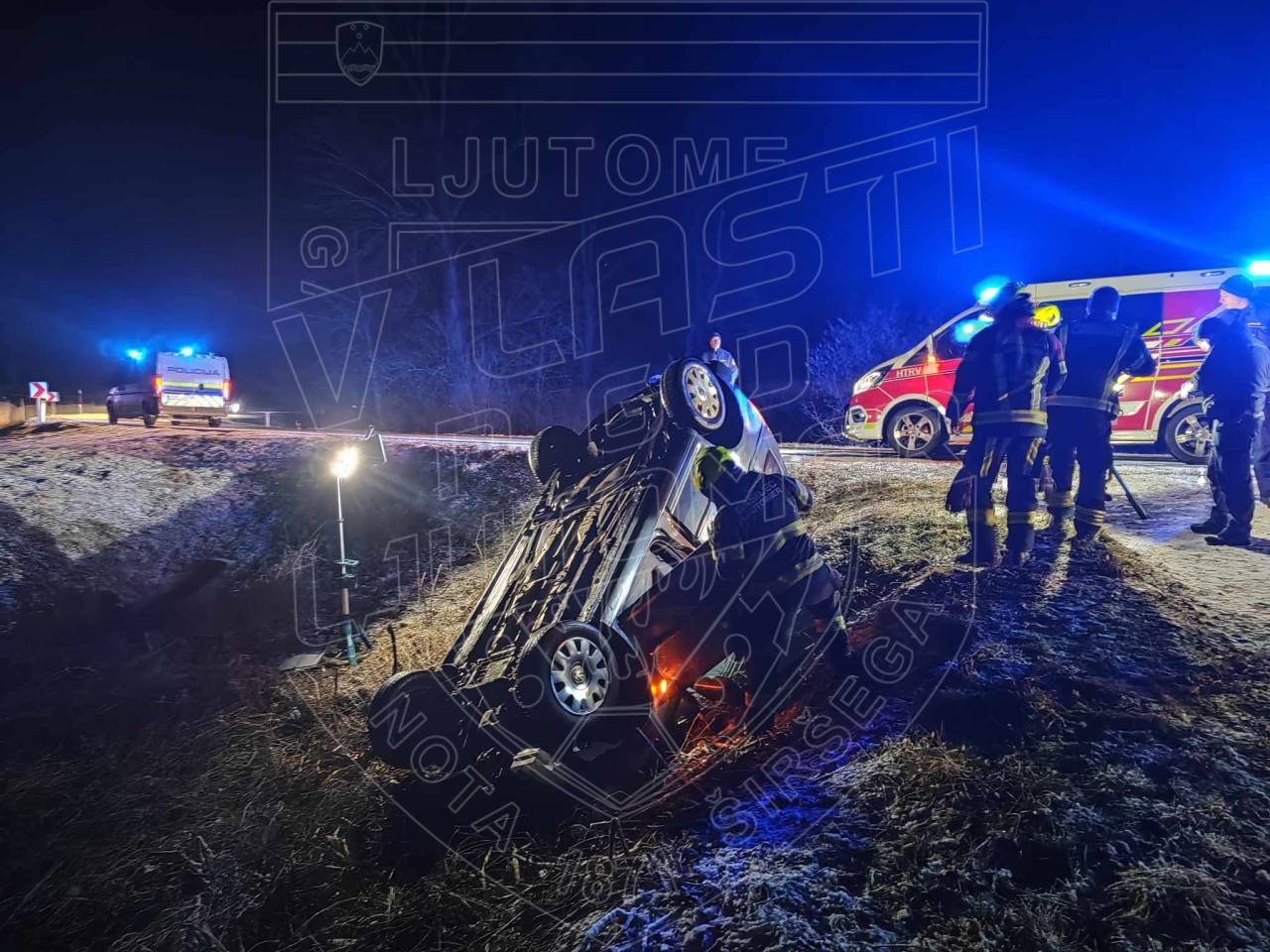 Uprava Republike Slovenije za zaščito in reševanje poroča, da je danes zgodaj zjutraj, ob 4.53, na cesti Stročja vas - Veščica, občina Ljutomer, osebno vozilo zapeljalo s cestišča in se prevrnilo na streho.