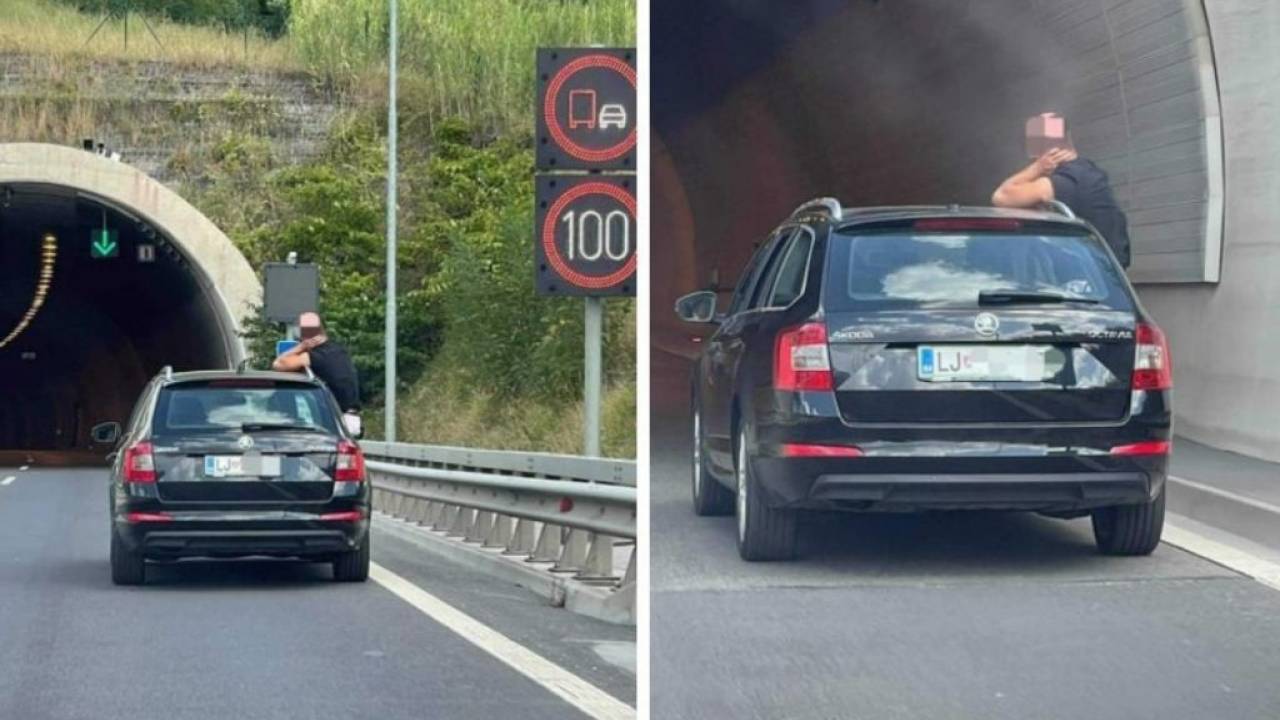 Moški je v predoru, kjer je hitrost omejena na sto kilometrov na uro, pri odprtem oknu sedel na sovoznikovih vratih in se tako skoraj z vsem telesom nagibal ven iz avtomobila.